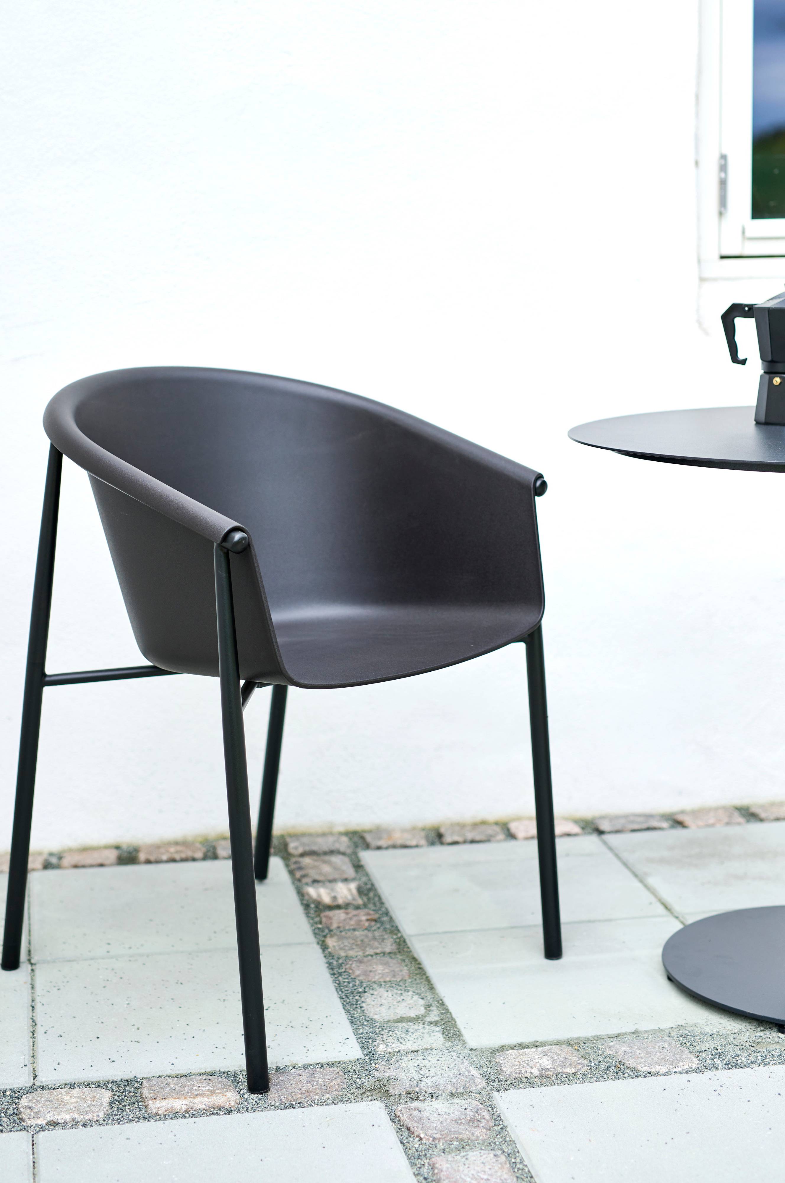 Tyylikäs kuppituoli, jossa tukevat jalat ja kiinteät käsinojat. Jalat on valmistettu sinkitystä metallista, mikä tekee niistä huoltovapaat. Tuoli on musta ja valmistettu kestävästä muovista.