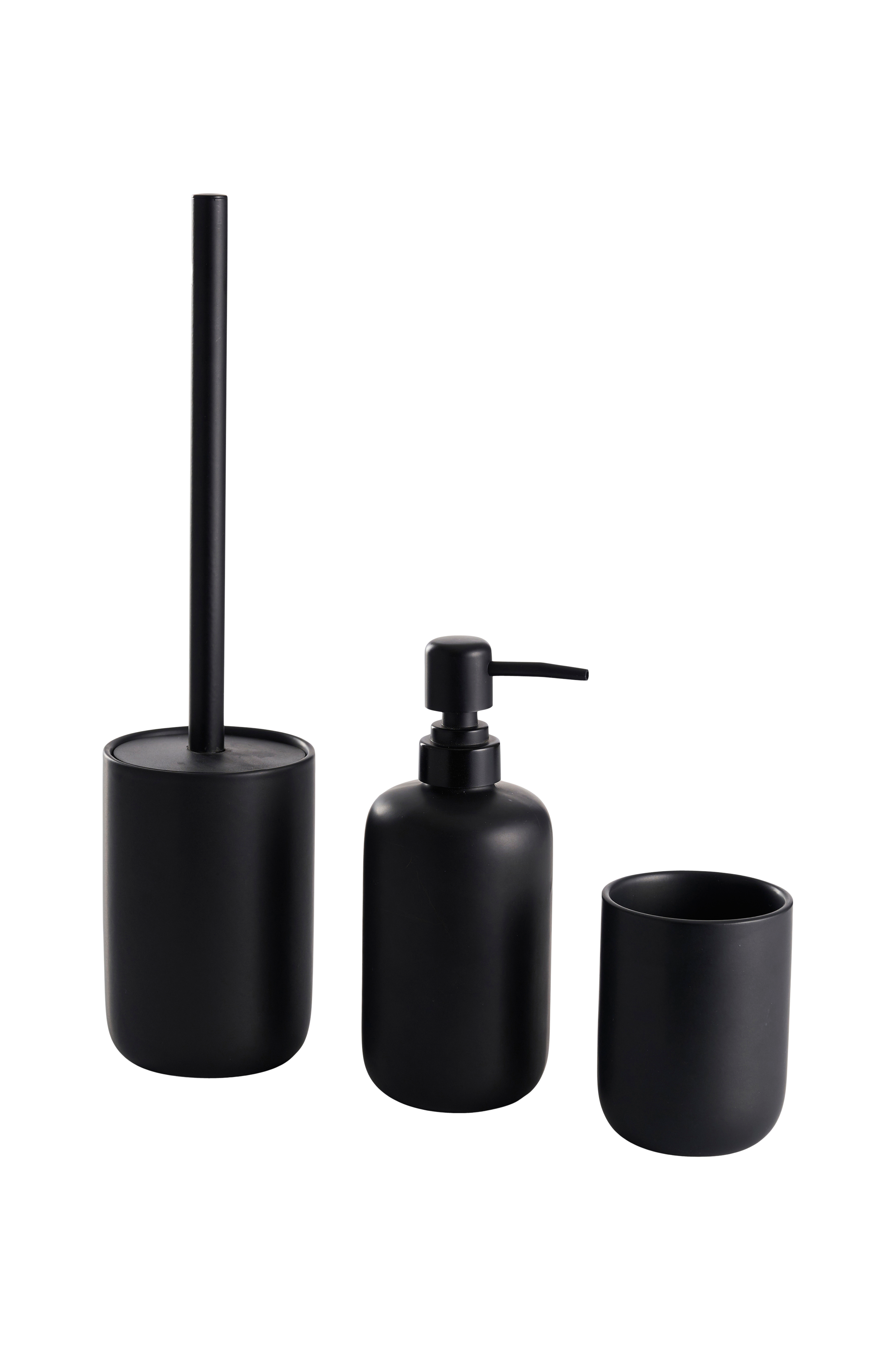Kylpyhuonesetti, jossa on saippua-annostelija, Wc-harja ja juomalasi. Saatavana mattamustana, kiiltävän valkoisena tai mattaharmaana.