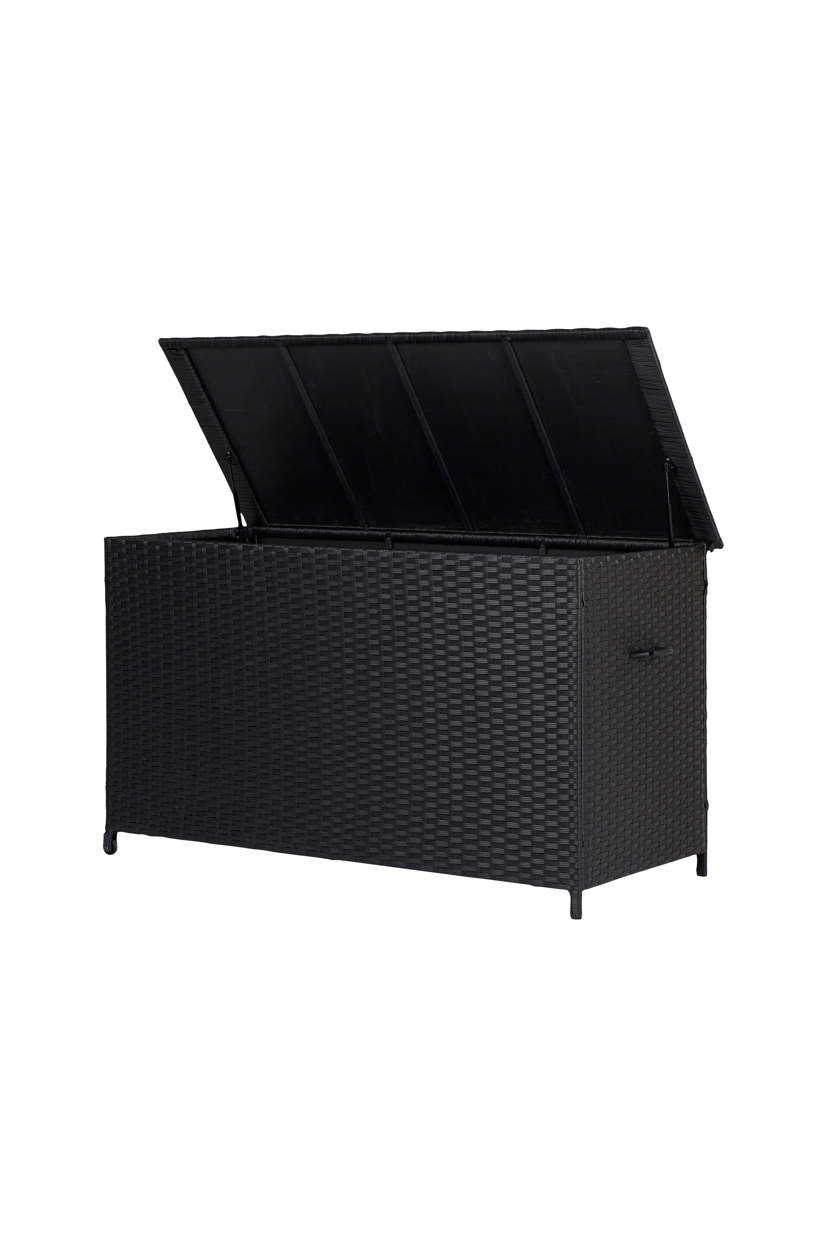 Pehmustelaatikko tyylikästä materiaalia, jossa kaunista ja tiiviisti punottua rottinkia. Huoltovapaa laatikko on helppo sijoittaa ulkotilaan. Isokokoiseen laatikkoon mahtuu monta pehmustetta. Musta tai beige väri luo hienon kontrastin puutarhakalusteisiin, ja se sopii useimmille terasseille ja ulkotiloihin. Laatikossa on pyörät, kahvat ja kaasujouset, jotka pitävät kannen auki. Polyrottinki ei homehdu ja kestää kosteutta.