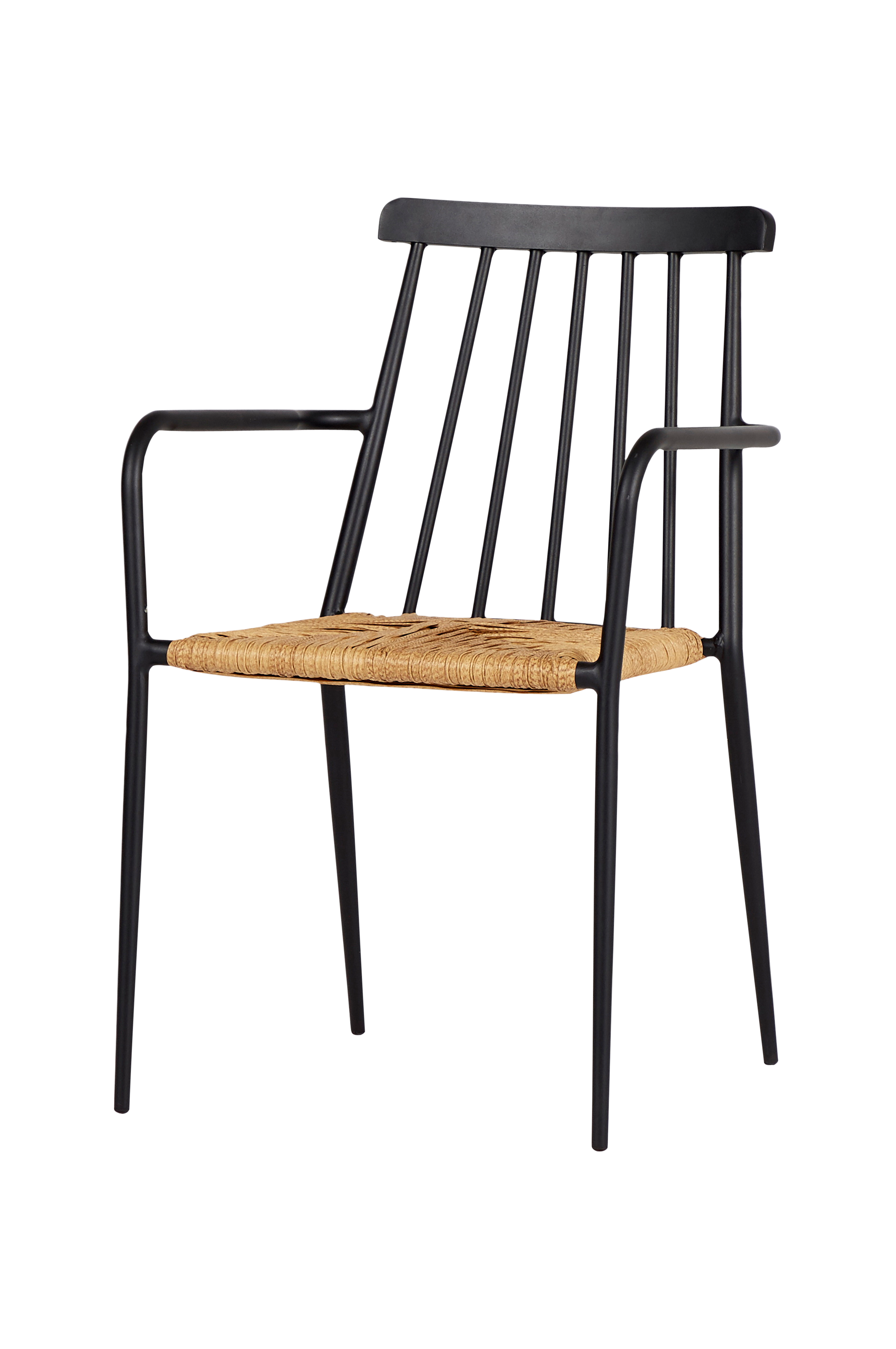 Puutarhatuolissa on perinteisesti muotoiltu selkänoja ja modernit, tyylikkäät jalat, jotka antavat tuolille komean ulkonäön. Käsin kudotun istuimen ansiosta tuoli on erittäin käyttökelpoinen ja mukava, varsinkin koska se on valmistettu korkealaatuisena, joka on suunniteltu pinottavaksi puutarhatuoliksi, mutta visuaalisesti se voisi yhtä hyvin mennä sisälle. Kudottu materiaali on polyrattan, joka on mukava materiaali, jolla on paljon kestävyyttä ja tekee tuolista huoltovapaan. Jalat on valmistettu alumiinista. Tämä malli on saatavana mustana, ja istuin on luonnonvärinen.