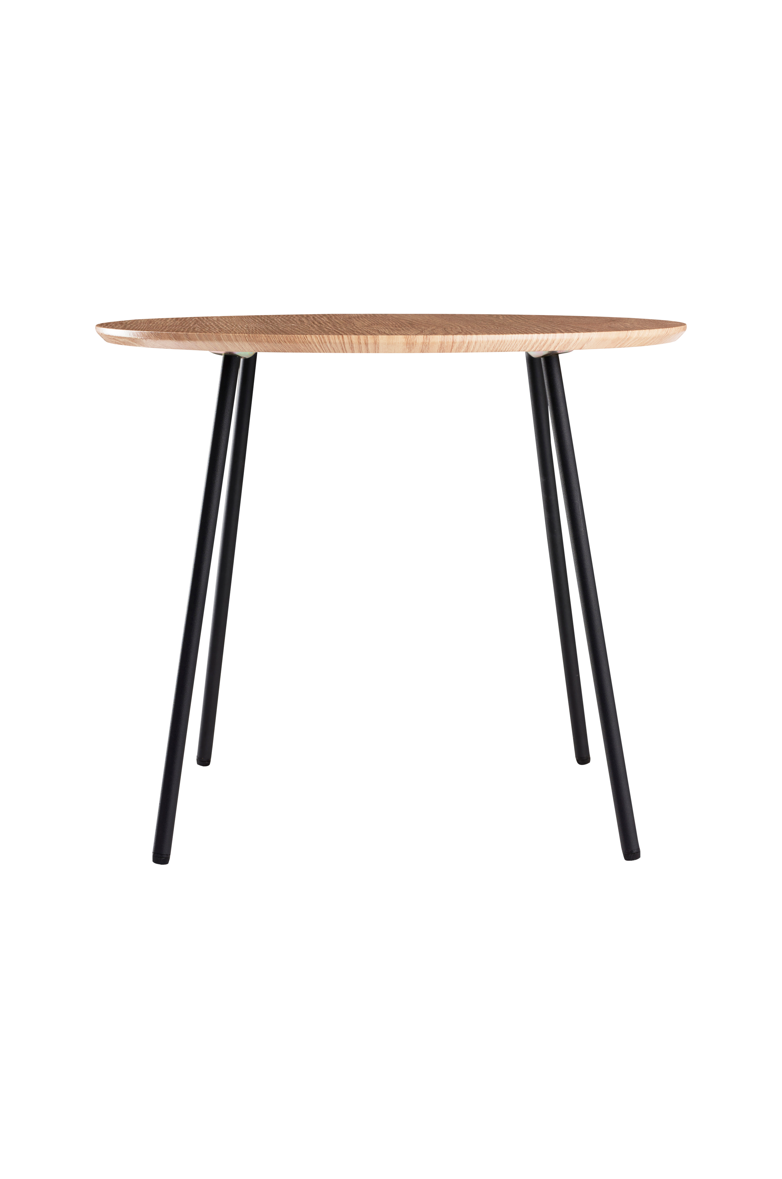 Tyylikäs pyöreä pöytä, jossa jauhemaalatut metallijalat ja kaunis pöytälevy aitoa puuta muistuttavalla PVC-kalvolla pinnoitettua MDF-levyä.