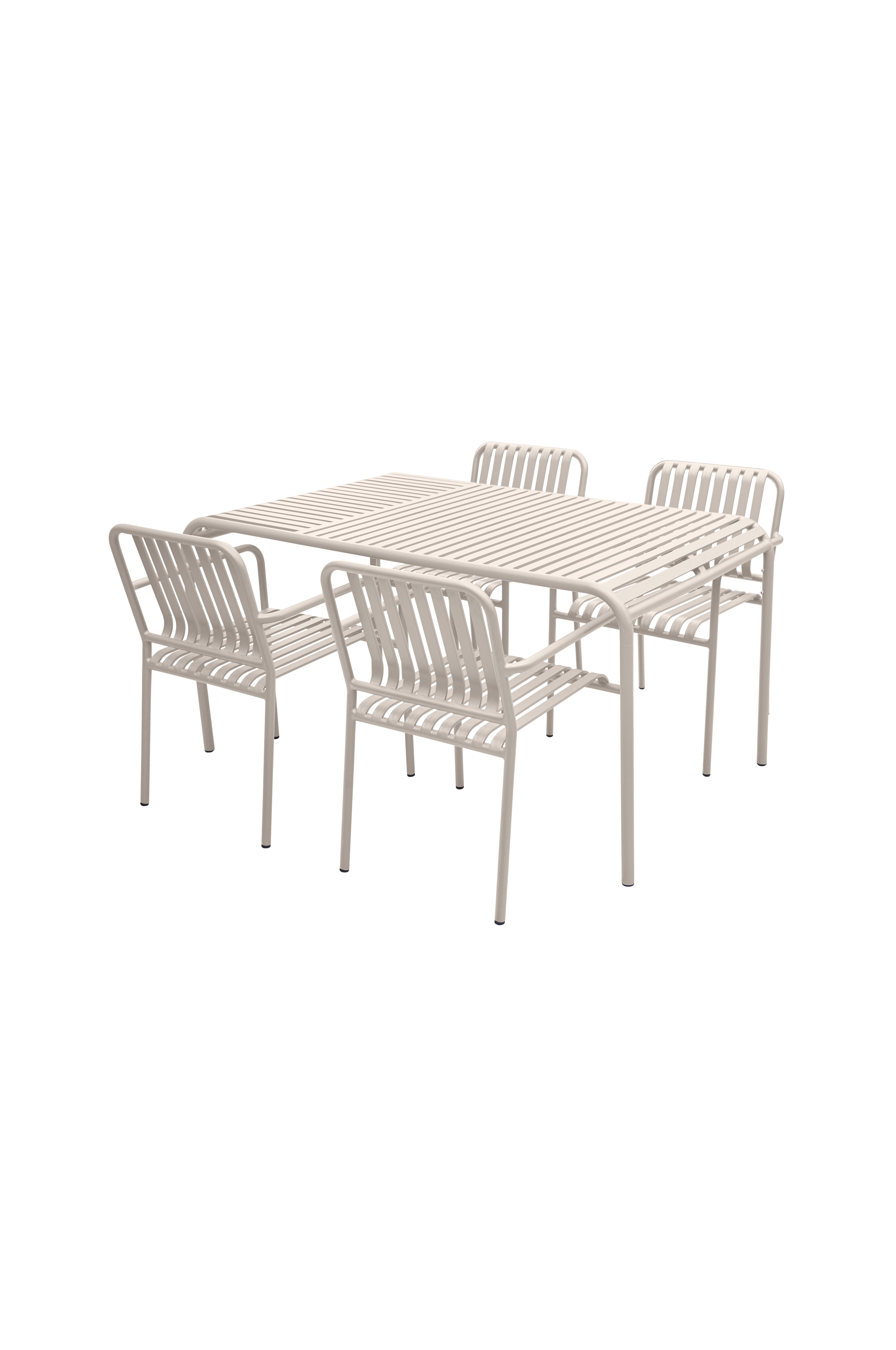 Sarjan tuolit ovat kaikki erittäin vankkoja. Niissä on näkyvät tyylikkäät hitsaussaumat ja suorat linjat. Leveät metallilistat antavat tuoleille myös siistin ilmeen. Tuolissa on pitkä istuinsyvyys, jossa voi istua mukavasti myös ilman tyynyjä. Tuolit on valmistettu kestävästä alumiinista, joka on vahva, mutta myös kevyt materiaali. Metalli on pinnoitettu, jotta se ei vaadi huoltoa. Tuoli on pinottava, jolloin se on helppo säilyttää. Sarjan puutarhapöydät on kaikki valmistettu kestävistä materiaaleista. Niissä on näkyviä hitsaussaumoja ja suoria linjoja, mikä antaa raa'an ja samalla tyylikkään vaikutelman. Nämä leveät metallilistat antavat pöydille myös puhtaan yksinkertaisen ilmeen, joka osuu nykyaikaiseen tyyliin, mutta on samalla joustava ja tavallisuudesta poikkeava. Niitä annetaan myös täydellä pöydällä toisessa päädyssä, mikä luo dynaamisen ilmeen yli puolet peittävien säleiden kanssa. Pöytä on valmistettu kestävästä alumiinista, joka on kevyt ja vahva materiaali. Metalli on käsitelty, jotta se olisi huoltovapaa.