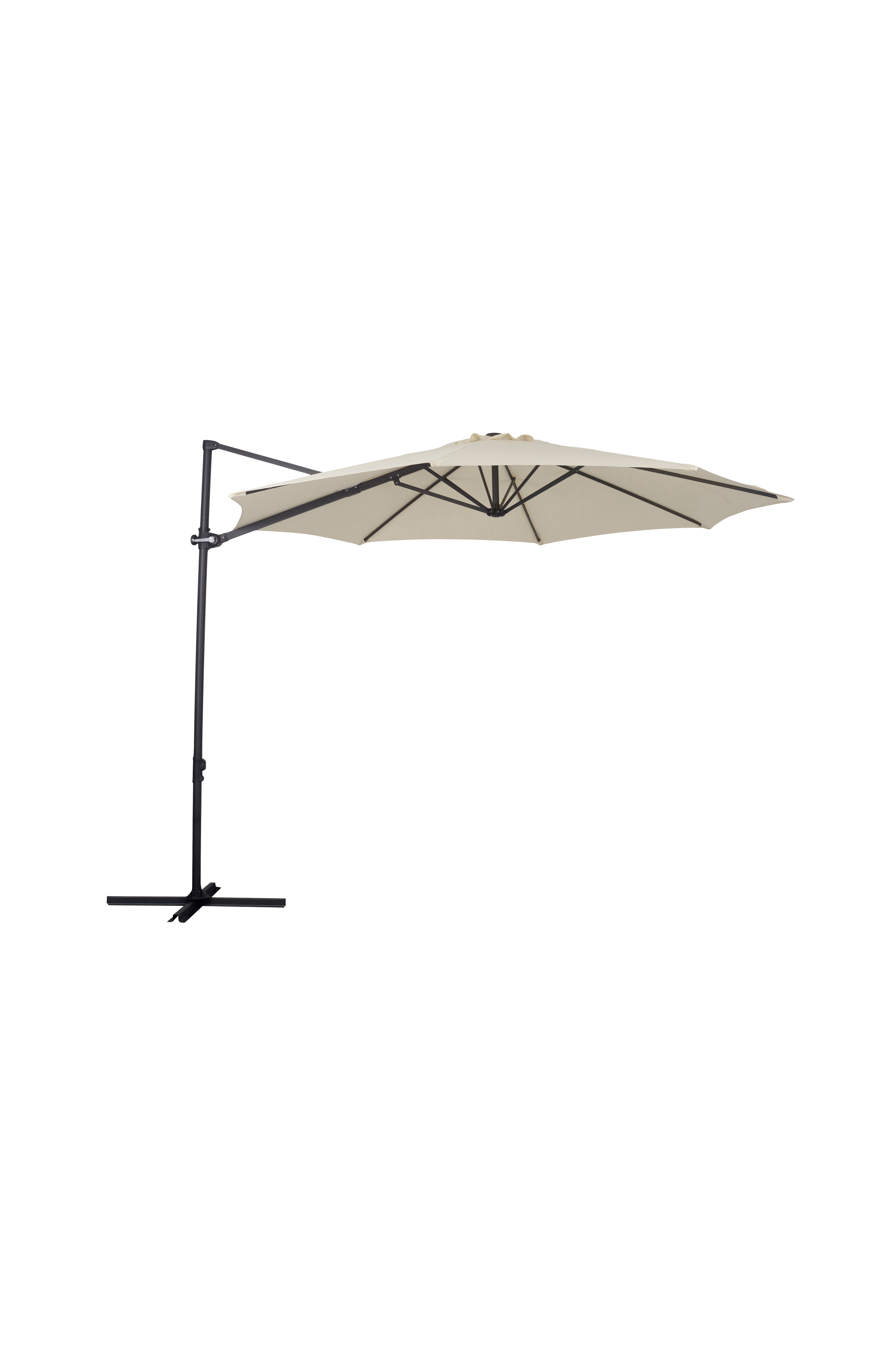 Riippuva aurinkovarjo sopii täydellisesti ulkotilaan, koska se riippuu sivulta, eikä keskellä ole isoa metallitankoa. Tätä mallia on saatavana mustana ja valkoisena. Vakaa alumiinirunko ja polyesterikangas 180 g/m².