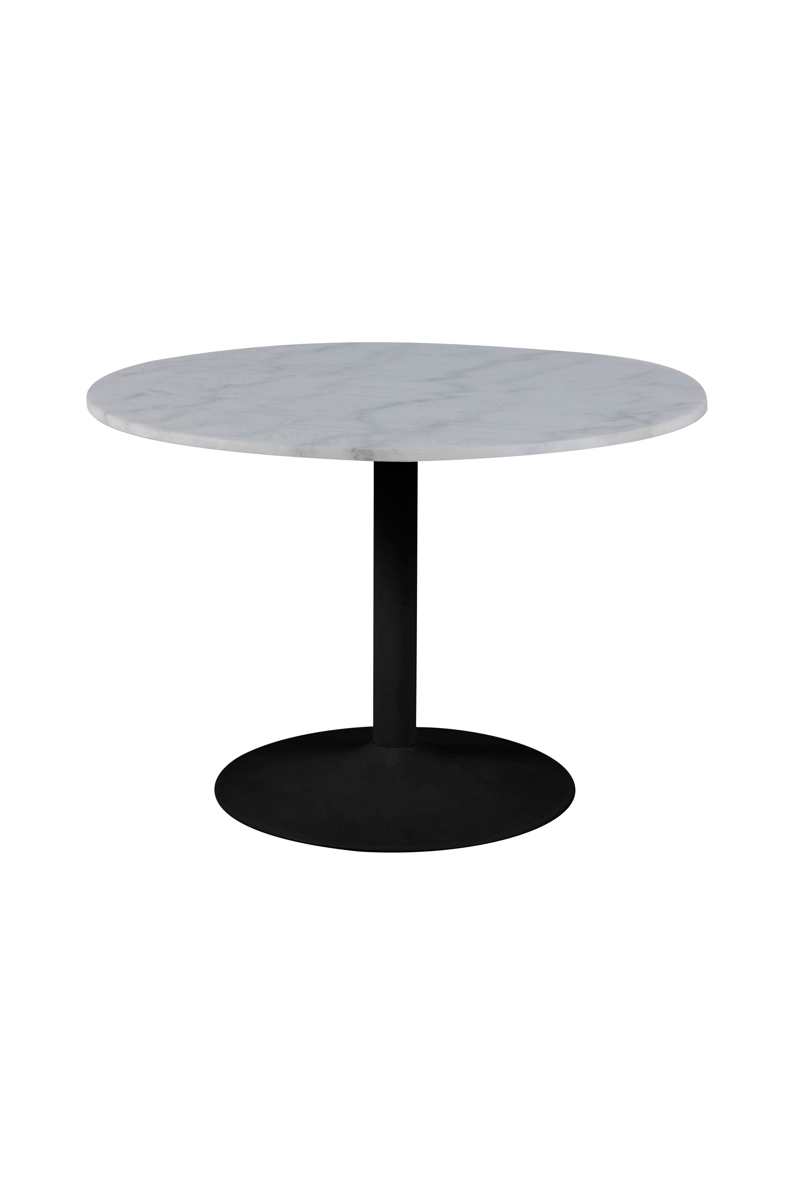 Jona-ruokapöytä, jossa kiillotettu marmorilevy ja mattamusta trumpettijalka metallia. Jokainen marmorilevy on ainutlaatuinen.