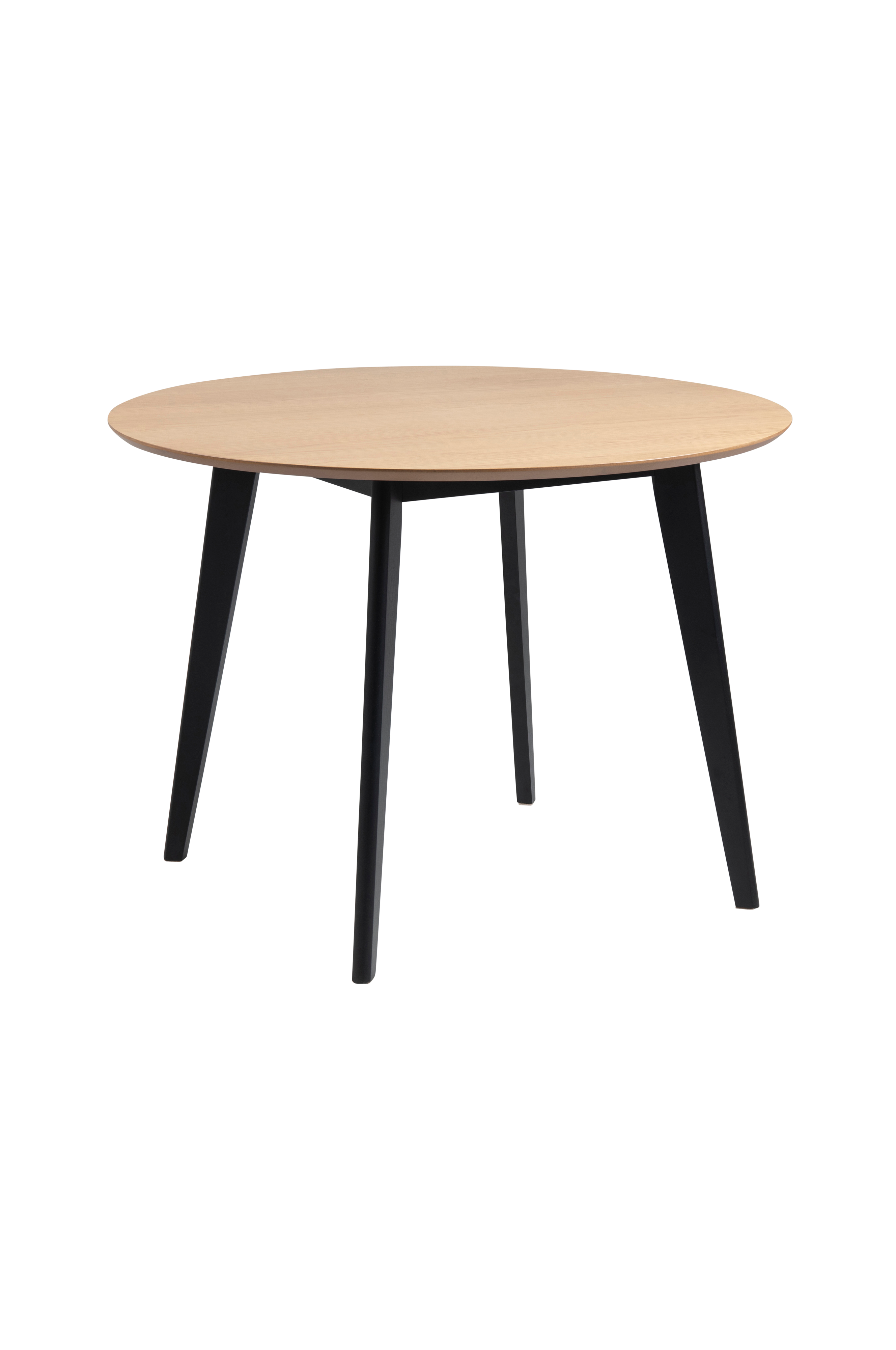 Pöytä tammiviilutettua kumipuuta. Mitat: halkaisija 105, korkeus 75 cm. Koottava.