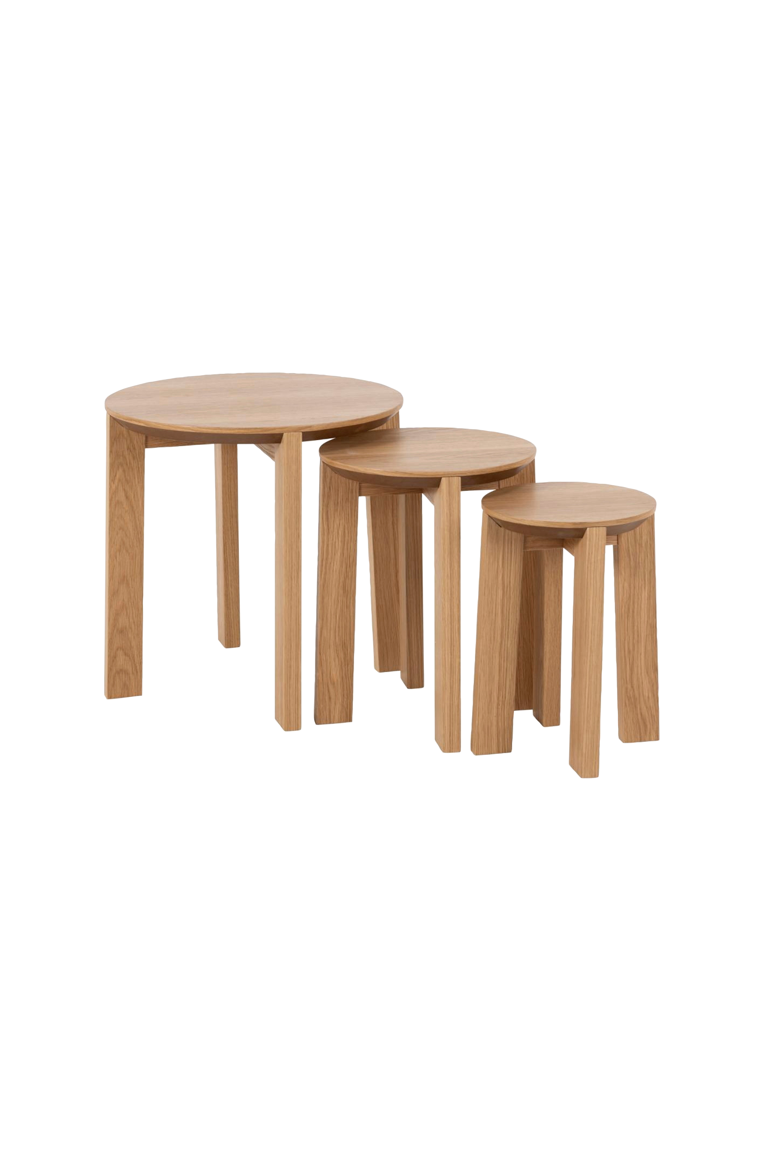 Kolme klassista sarjapöytää modernilla tvistillä. Suorakulmaiset jalat yhdistyvät upeasti pöytälevyyn. Hieno yksityiskohta viimeistelee kokonaisuuden. Paksut jalat on sijoitettu niin, että ne antavat pöydälle kevyen ilmeen. Tammiviilutettua MDF-levyä. Halkaisijat 50, 35 ja 27 cm. Korkeudet 50, 45 ja 40 cm.