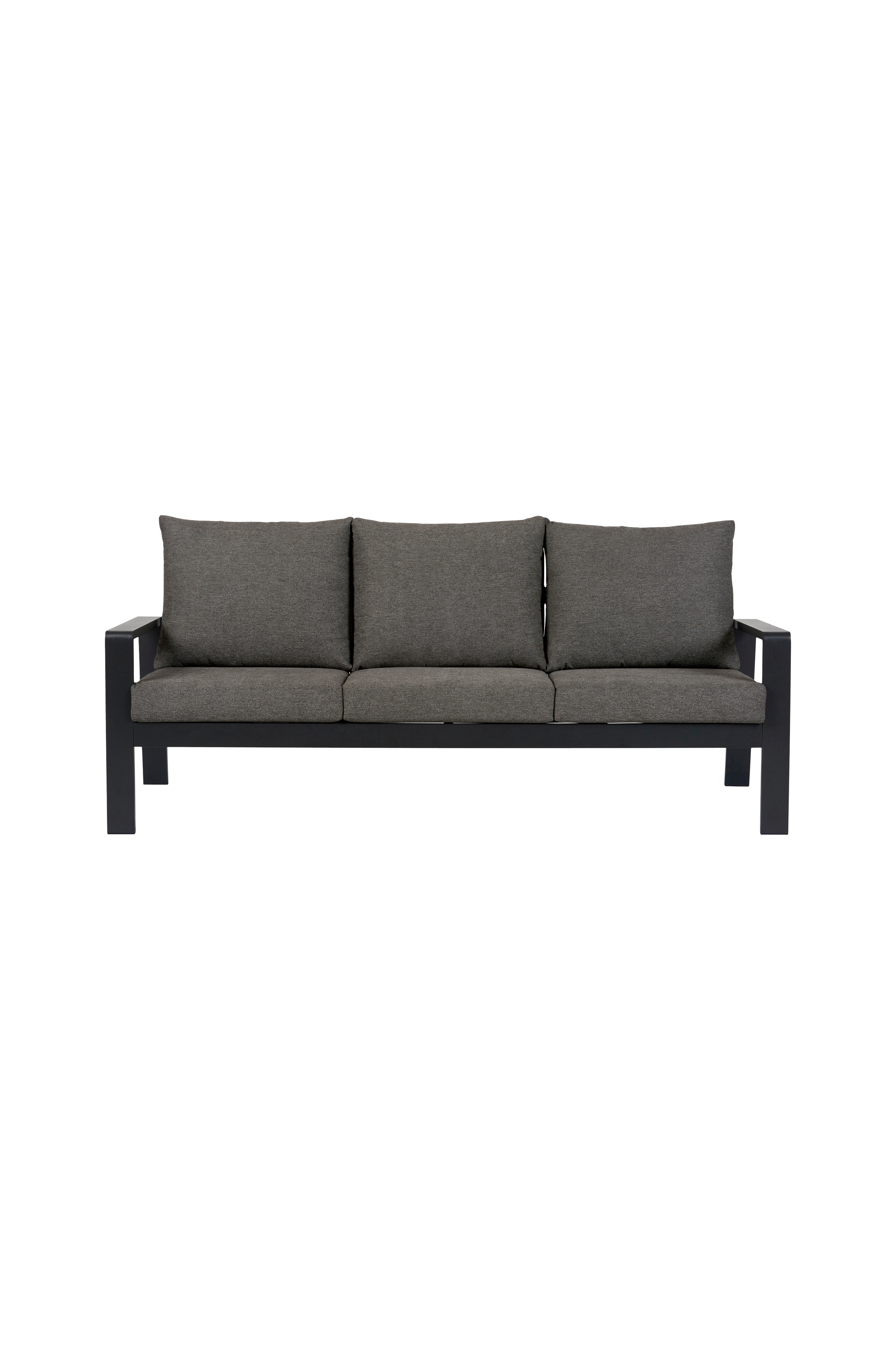 Tämän sohvan runko on alumiinia ja siinä on pitkät litteät muodot. Sohva sopii lounge-settiin ja yksinkertaisen muotonsa ansiosta se sopii useimpiin paikkoihin. Runko on musta ja tyynyt tummanharmaata polyesteriä, jotka ovat vedenkestäviä ja joissa on mukava istua.