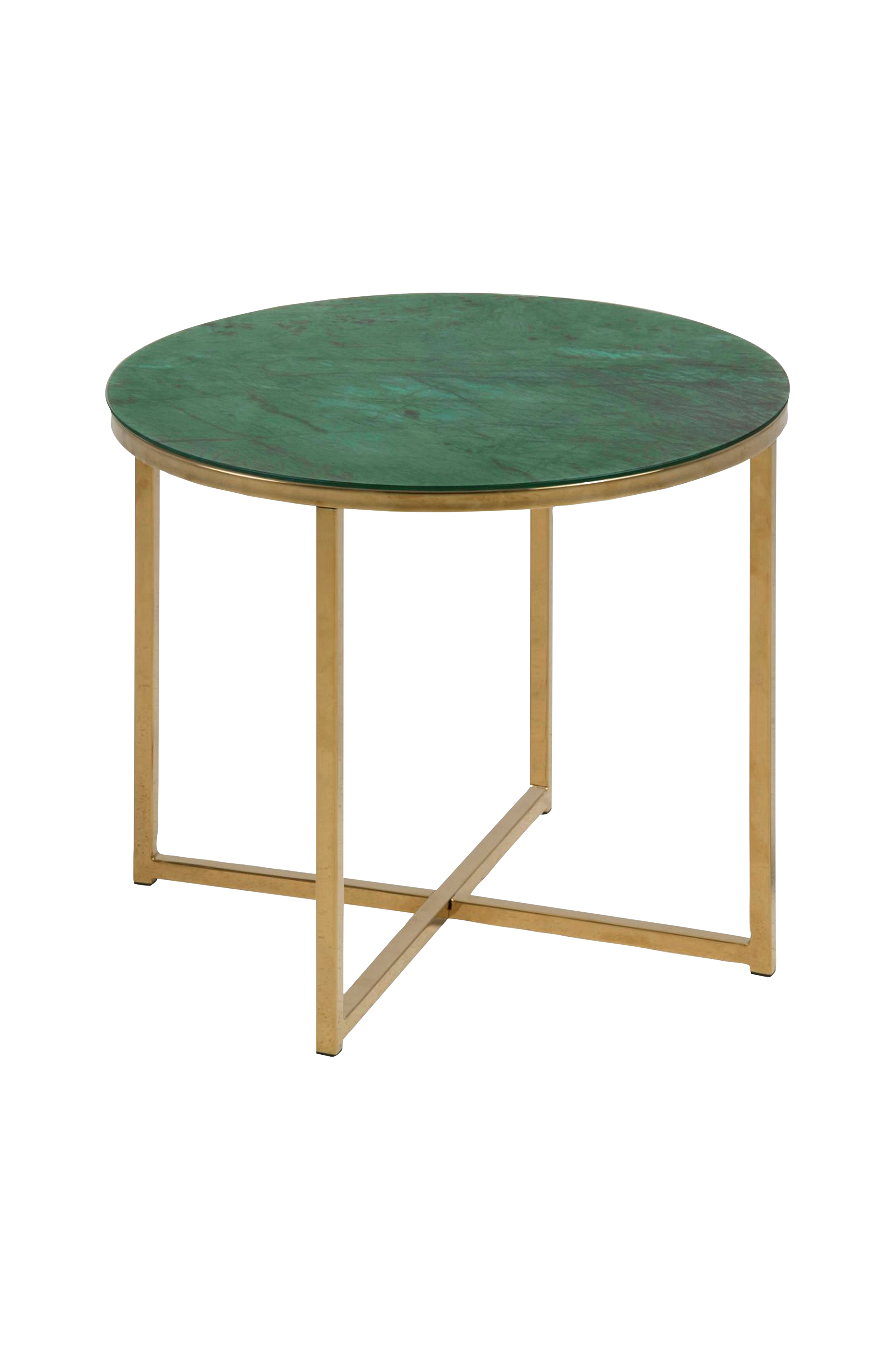 Moderni ja tukeva sivupöytä. Sohvapöydässä on marmoria muistuttava pöytälevy, ja sen pyöreä muoto antaa reilusti tilaa koriste-esineille. Ristikkäinen metallirunko muodostaa tukea antavan kehyksen lasiselle pöytälevylle. Huolella valikoidut, helppohoitoiset materiaalit.
