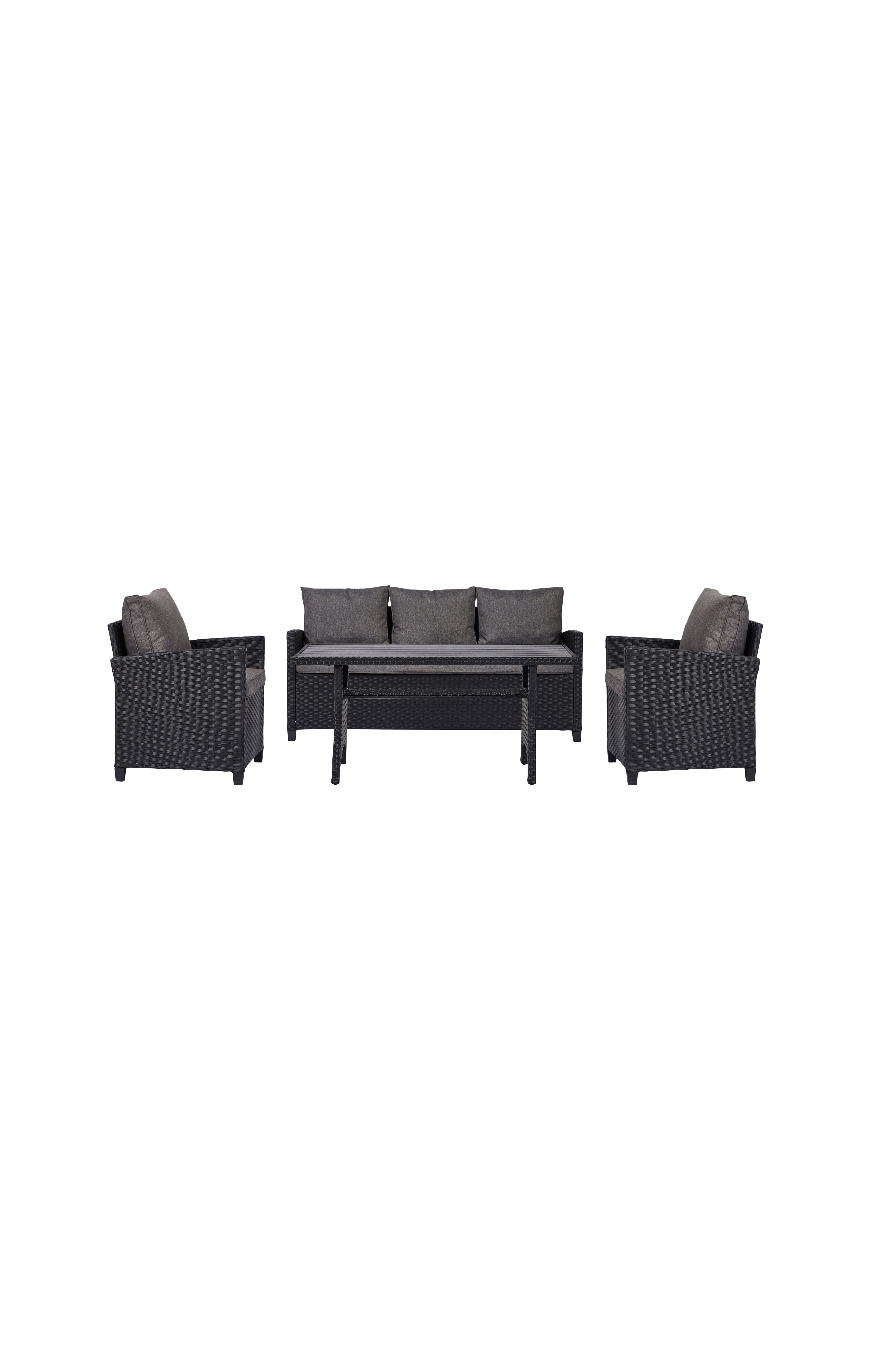 Pöydässä on sama punottu kuvio. Pöytälevy on puuta muistuttavaa harmaata polywoodia. Pehmusteet ovat pehmeät, mutta mukavat ja miellyttävät istua. Pehmusteet ovat vettä hylkivää polyesteriä. Punos on mustaa ja pehmusteet tummanharmaat.