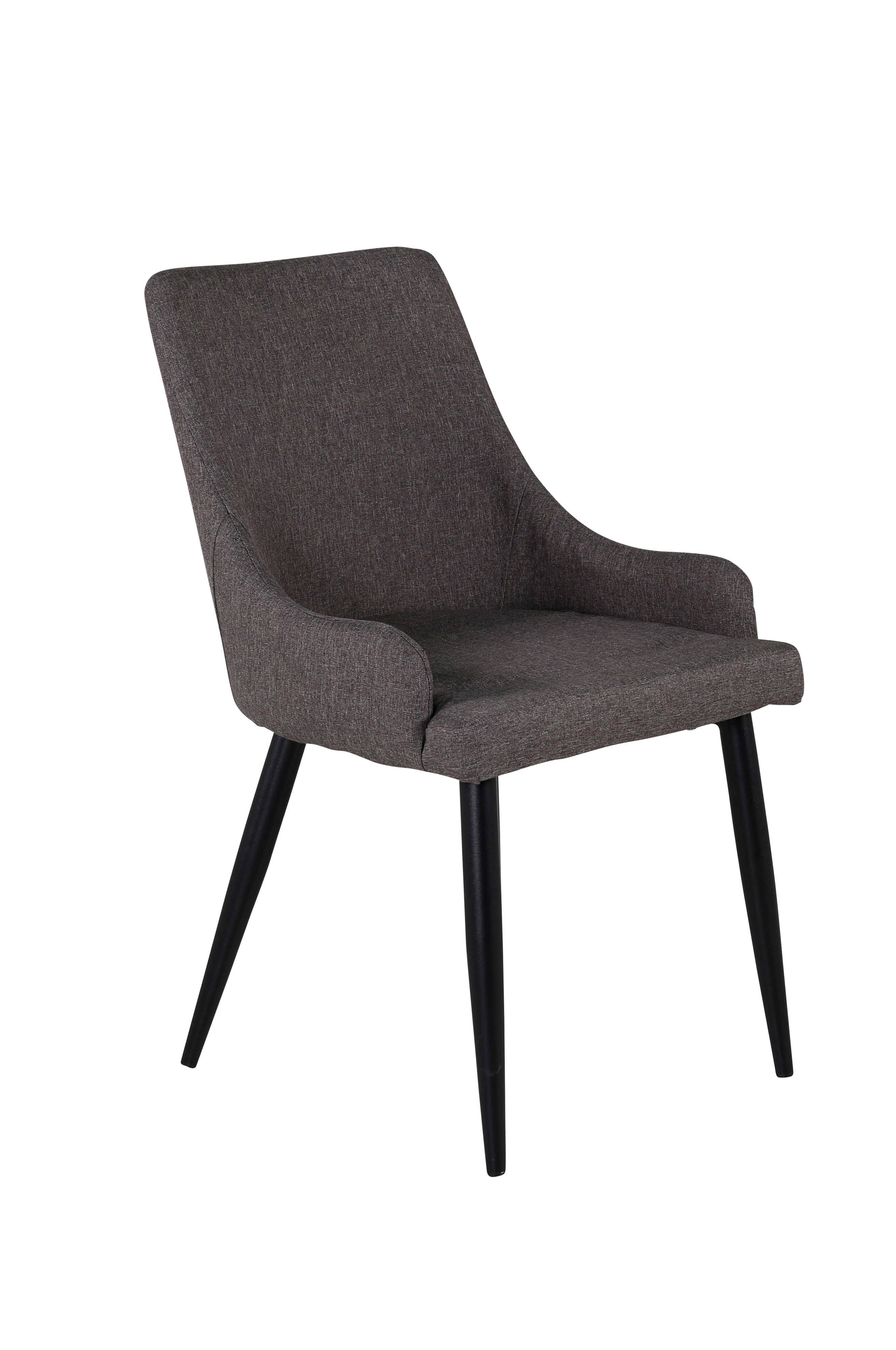Moderni ja mukava ruokapöydän tuoli. Vakaa tuoli, jossa mustat metallijalat ja päällinen harmaata kangasta.
