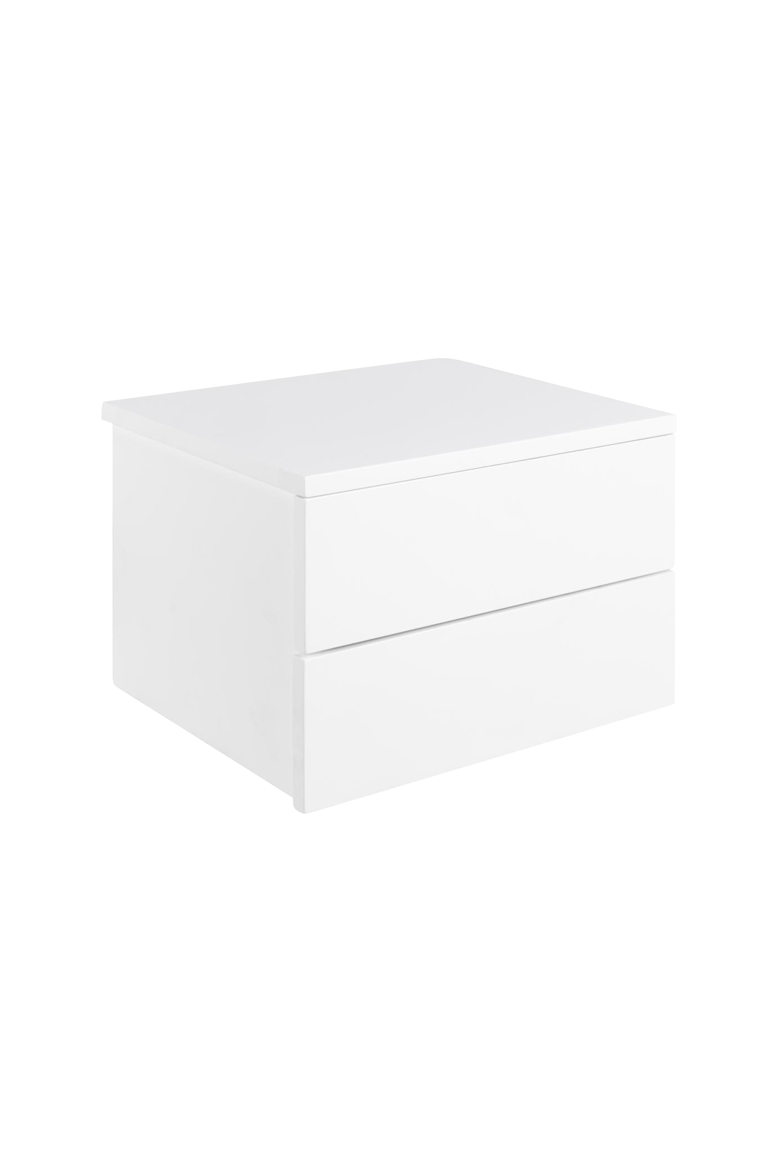 Ihanteellinen kumppani mihin tahansa makuuhuoneeseen, jos pidät minimalistisesta, tyylikkäästä ilmeestä. Puhtaiden linjojen ja valkoiseksi maalatun pinnan ansiosta tämä yöpöytä ei valloita makuuhuonettasi. Yöpöytä on helppo ripustaa sänkysi viereen haluamallesi korkeudelle. Kahden laatikon ansiosta sinulla on runsaasti tilaa kirjoille, laseille ja muulle tarvitsemallesi.