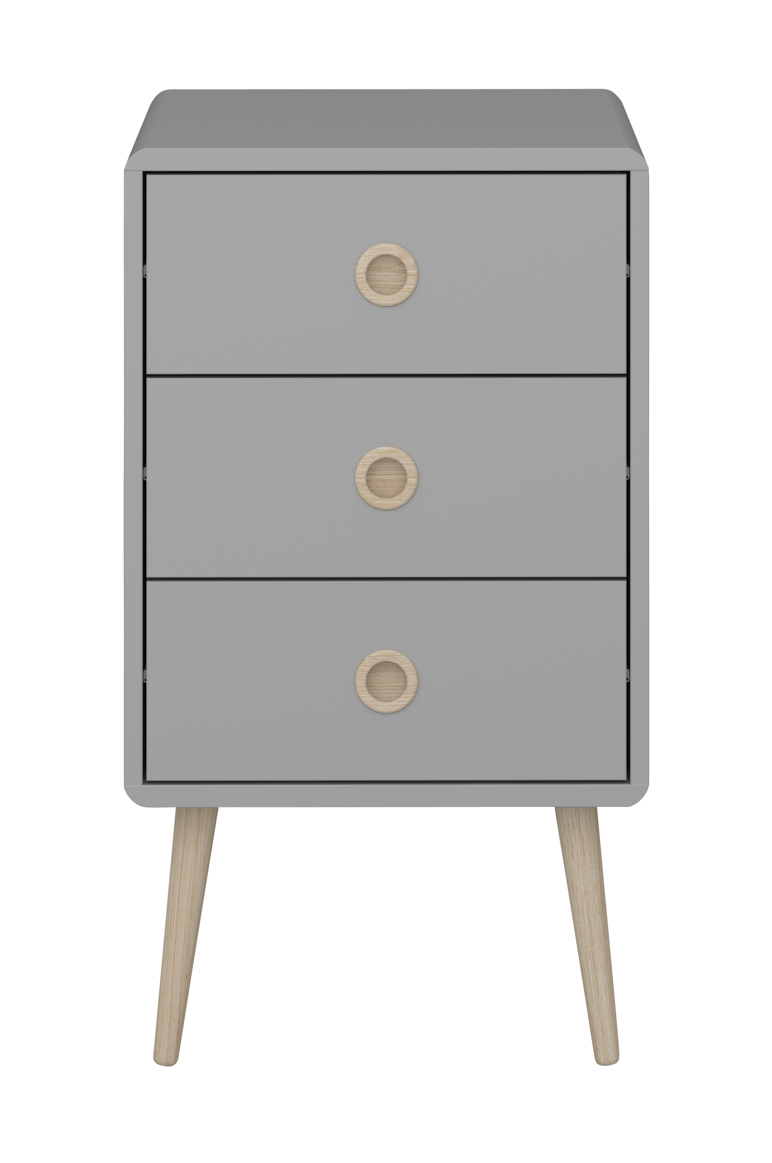 Yöpöytä, jossa 3 säilytyslaatikkoa. Maalattua MDF-levyä, vetimet ja jalat massiivitammea. Helppo koota.