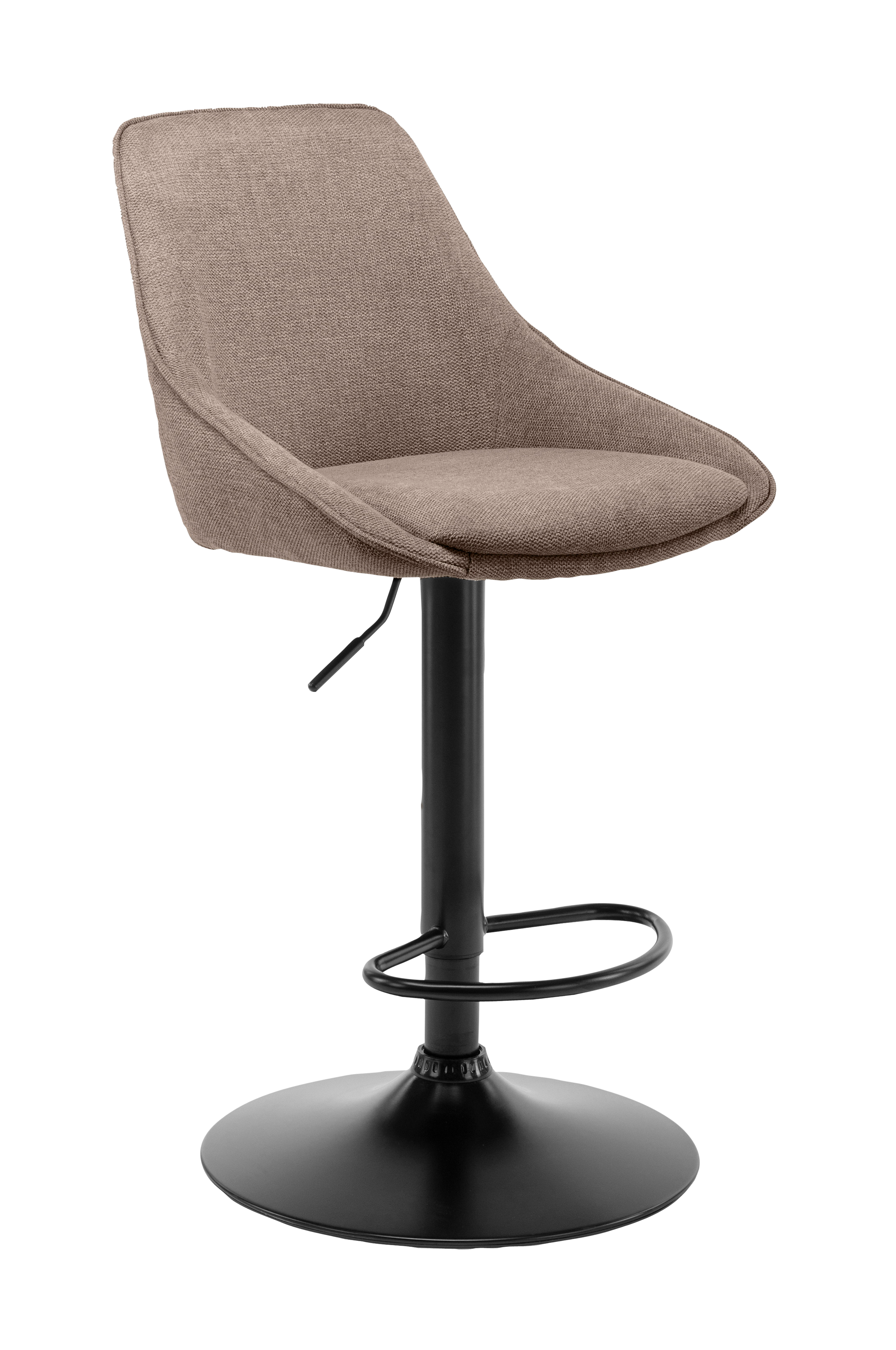 Nostettava ja laskettava baarituoli, joissa kangasverhoilu ja maalattu metallijalusta.