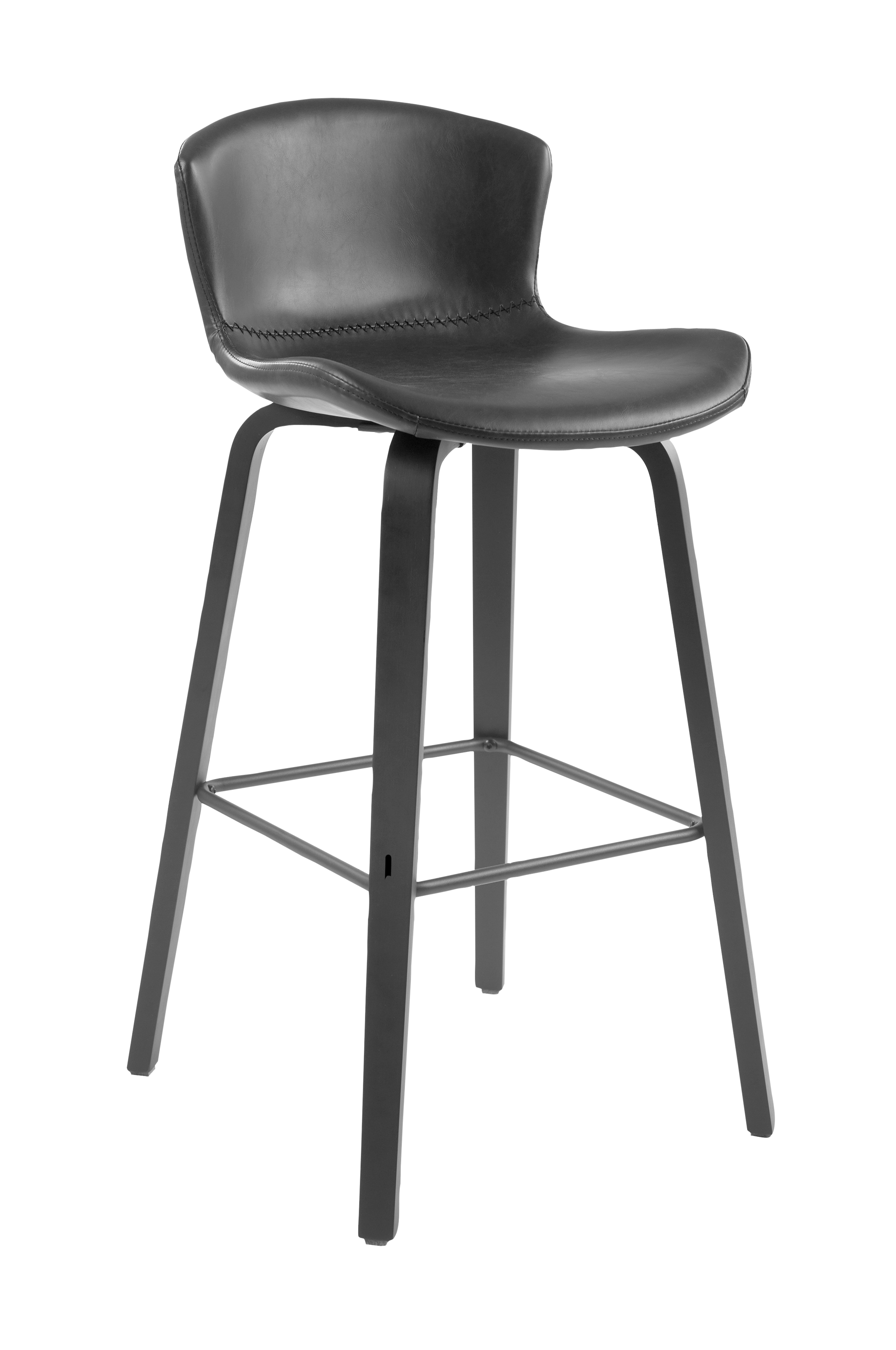 Tyylikäs baarituoli, jossa tekonahkaverhoilu ja jalat lakattua tammea. Jalkatuki maalattua metallia.