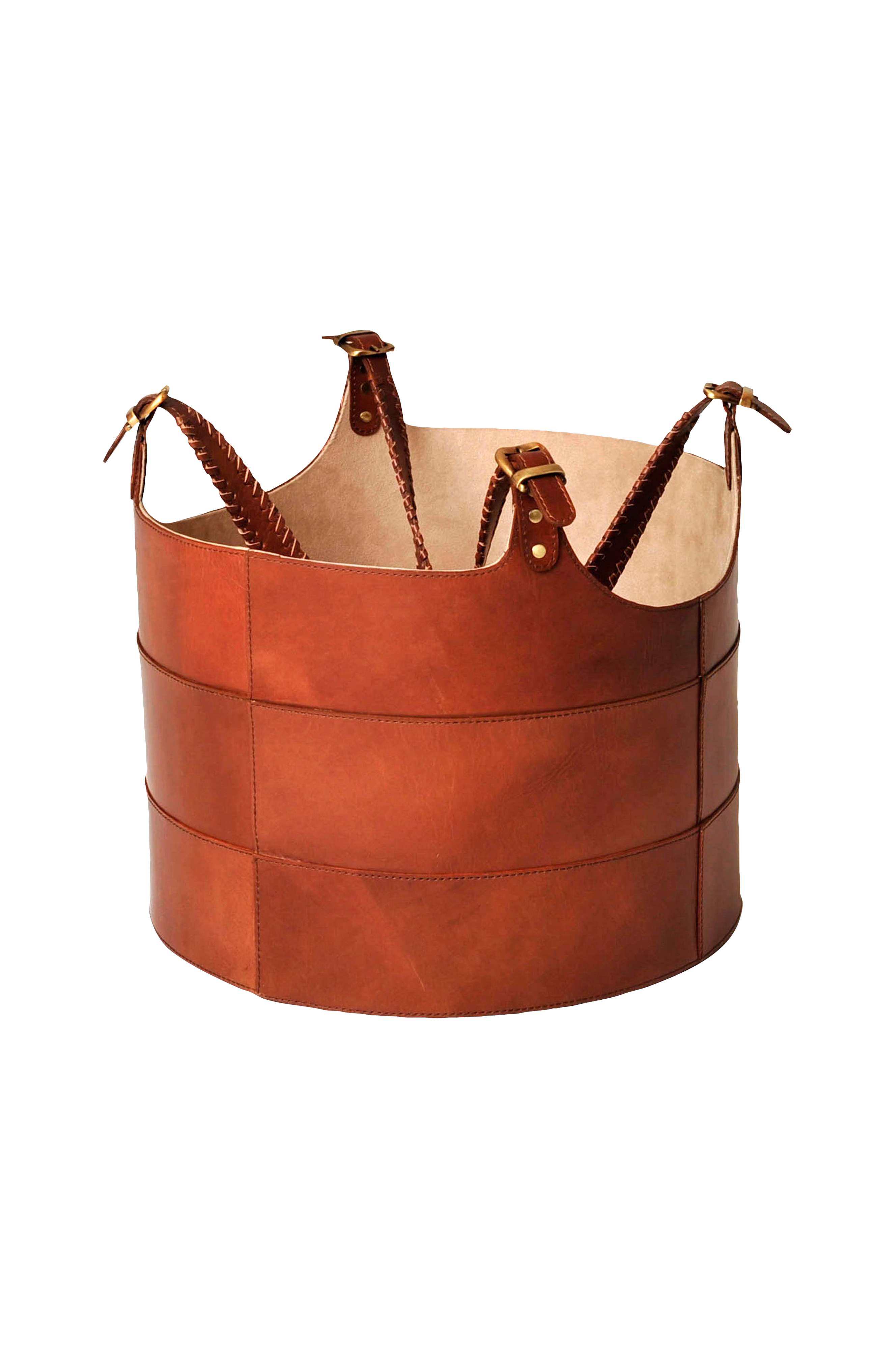 Nahkainen halkokori, jossa kahvat.