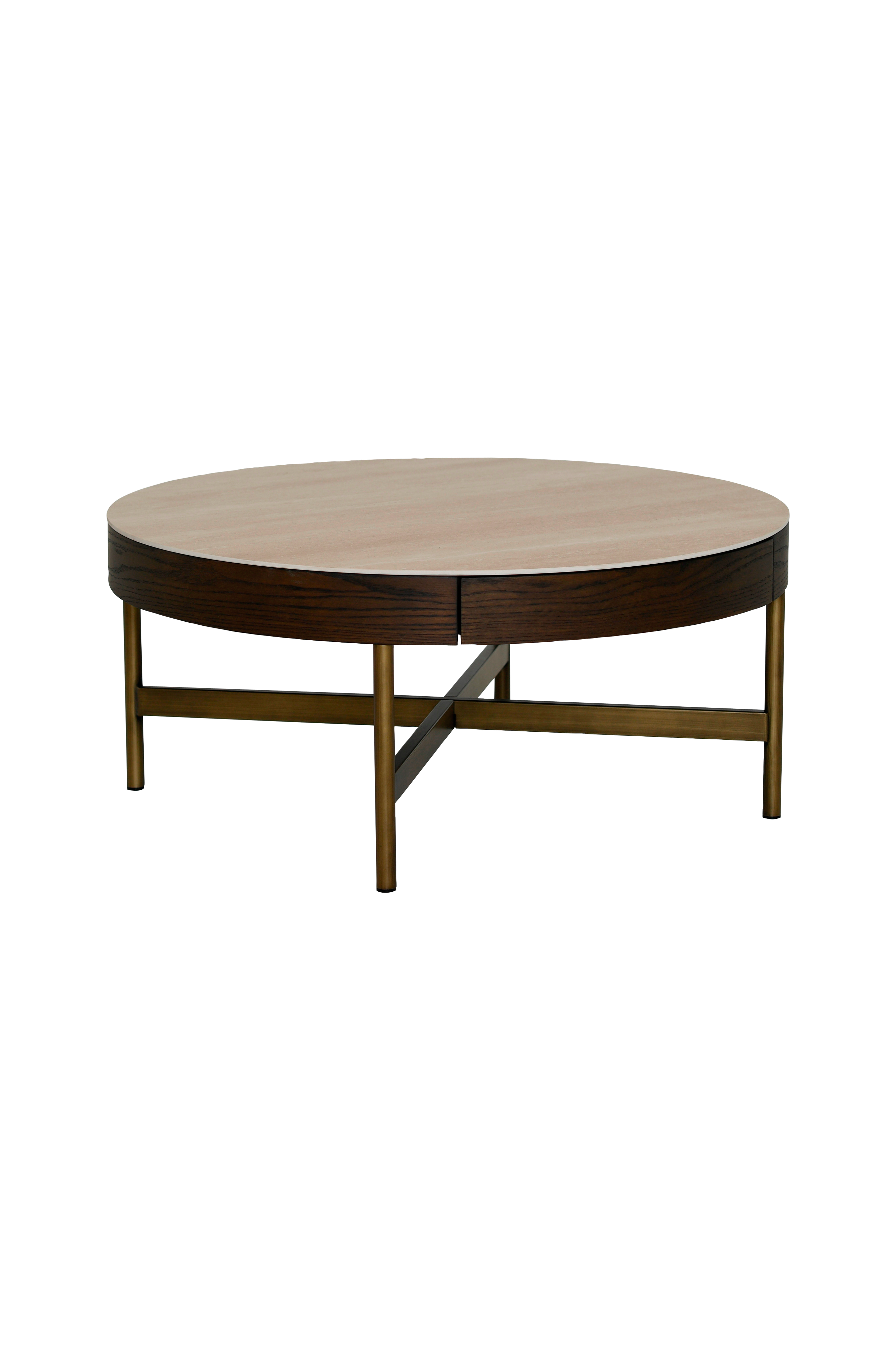 Pyöreä sohvapöytä, jossa on laatikko. Pöytälevy on valmistettu travertiinikeraamisesta, joka tarjoaa luonnollisen kivimaisen ilmeen ja sileän viimeistelyn. Jalat on valmistettu metallista, jossa on pronssinvärinen viimeistely, joka tarjoaa tukevan perustan ja ripauksen eleganssia.