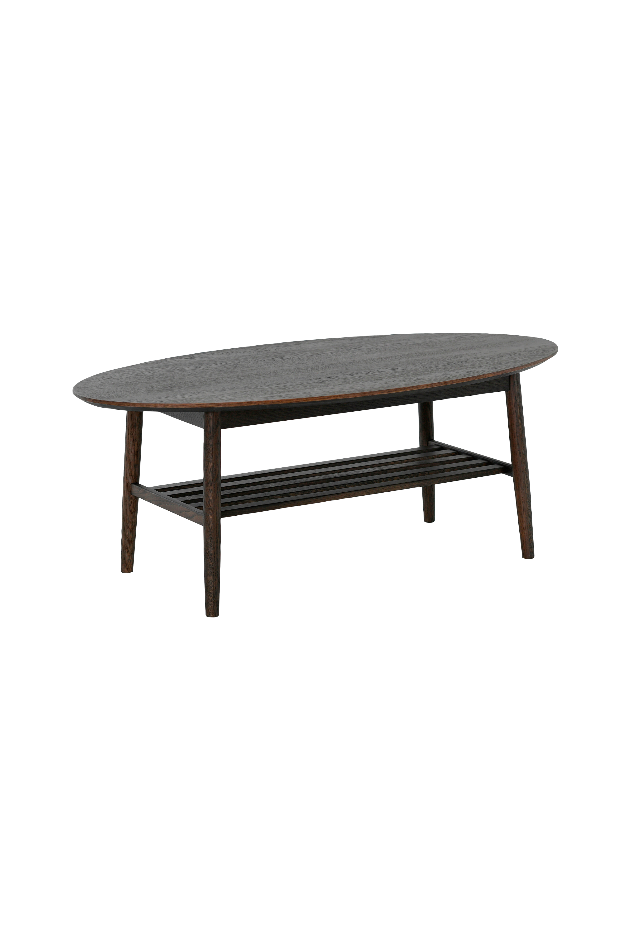 Lakattua tammiviilua oleva soikea kahvipöytä. Siinä on sileä, hieman pyöristetty pöytälevy, jossa on näkyvää puunjyvää, ja se on tuettu neljällä jalalla. Pöytälevyn alapuolella on avonainen ritilähylly lisäsäilytystä tai esillepanoa varten.