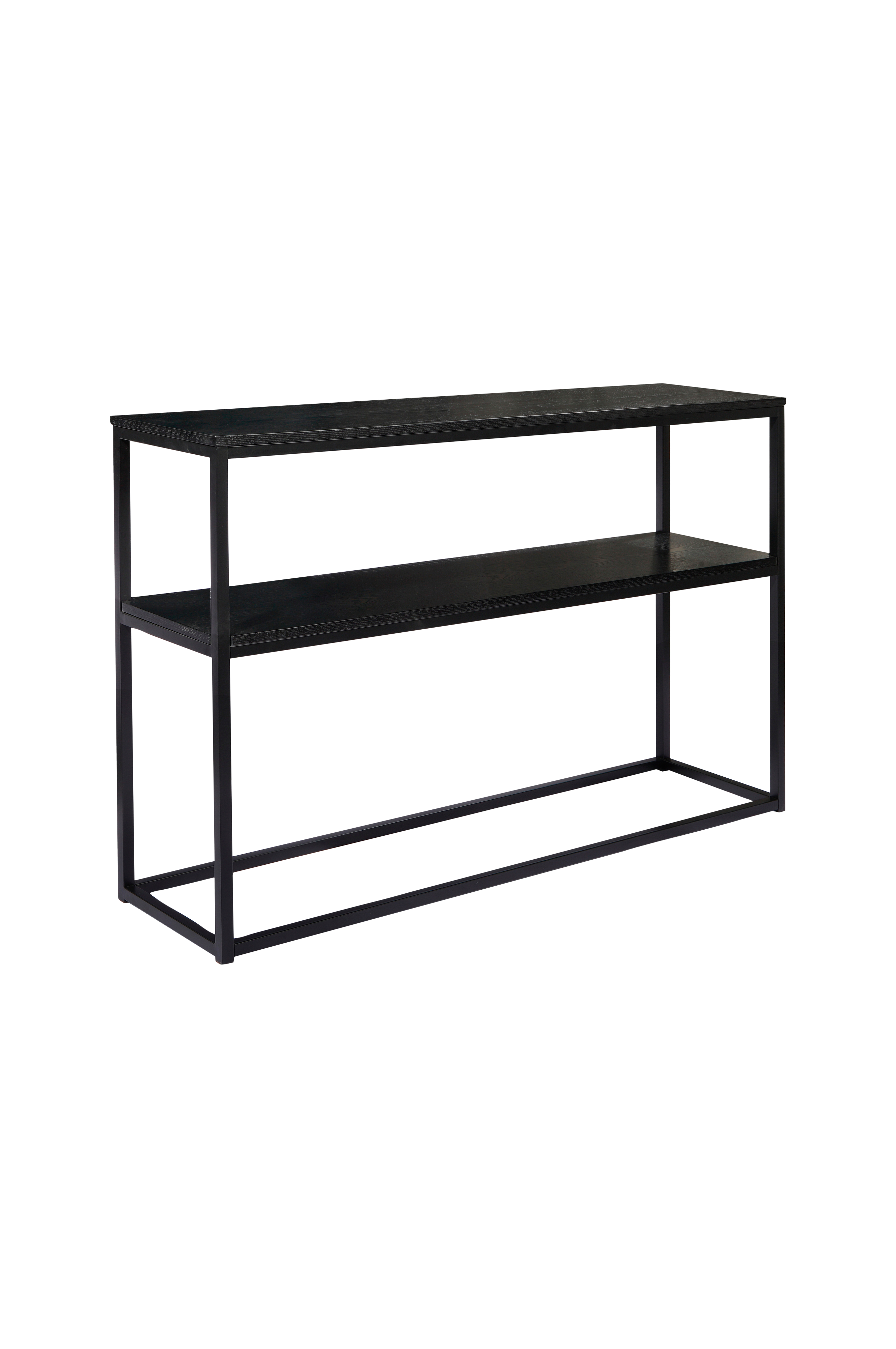 Konsolipöytä, jossa tasot lakattua saarniviilua ja jalusta maalattua metallia.