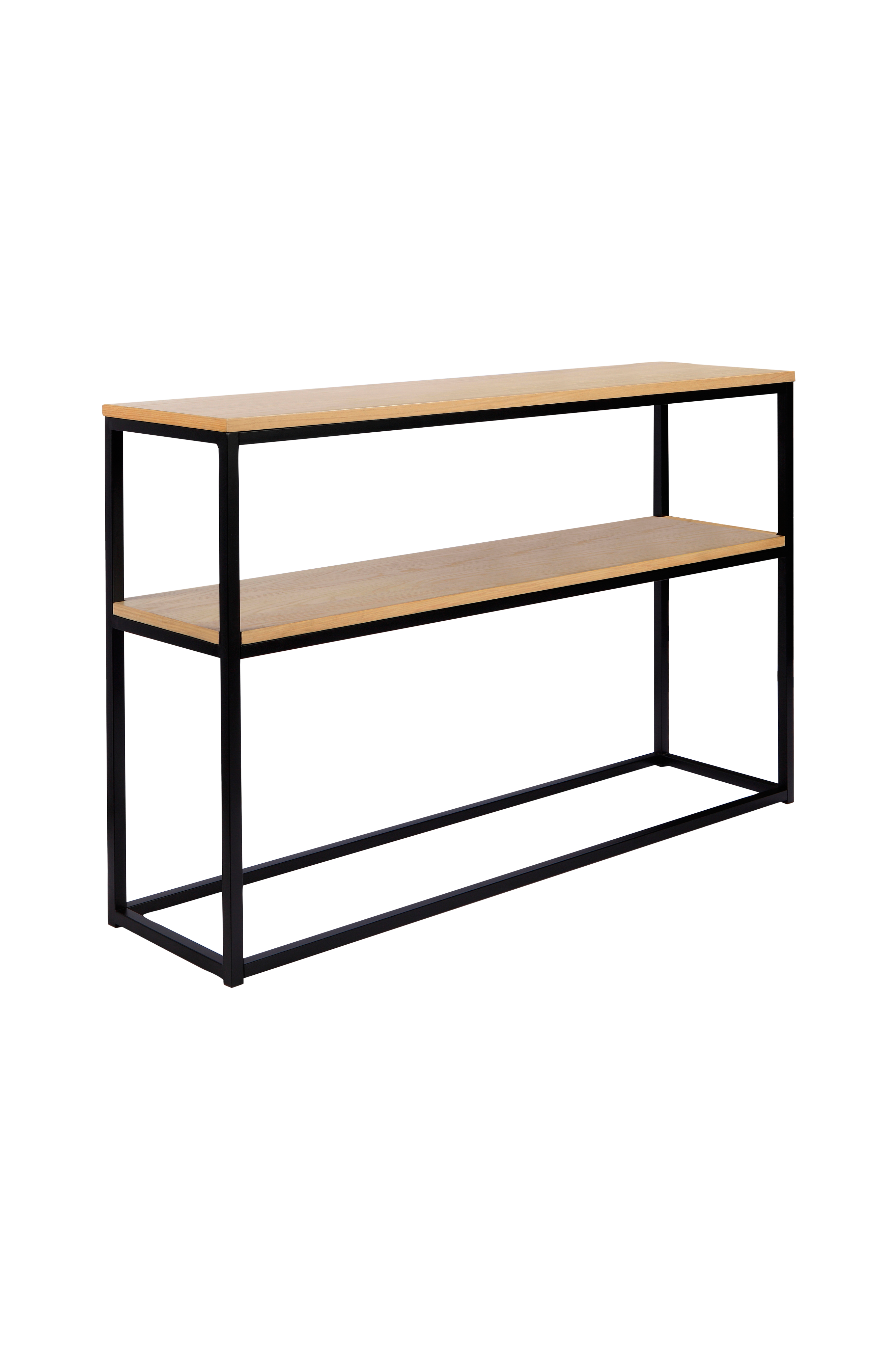 Konsolipöytä, jossa tasot lakattua pigmentoitua tammiviilua ja jalusta maalattua metallia.