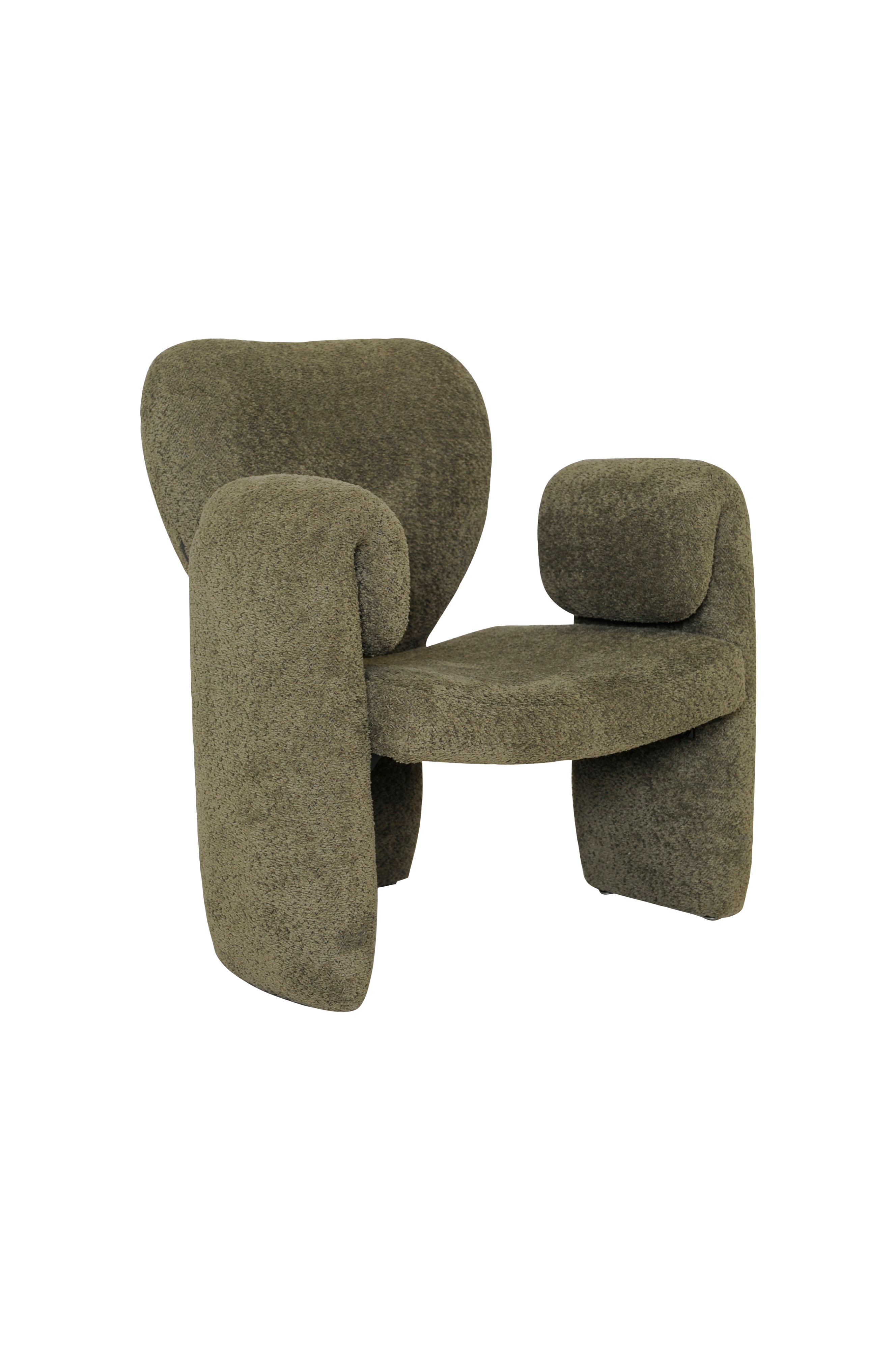 Moderni nojatuoli pehmeässä ja pyöreässä muodossa. Pehmeä verhoilu peittää tämän tuolin vaahtomuovitäytteisen istuimen ja selkänojan.
