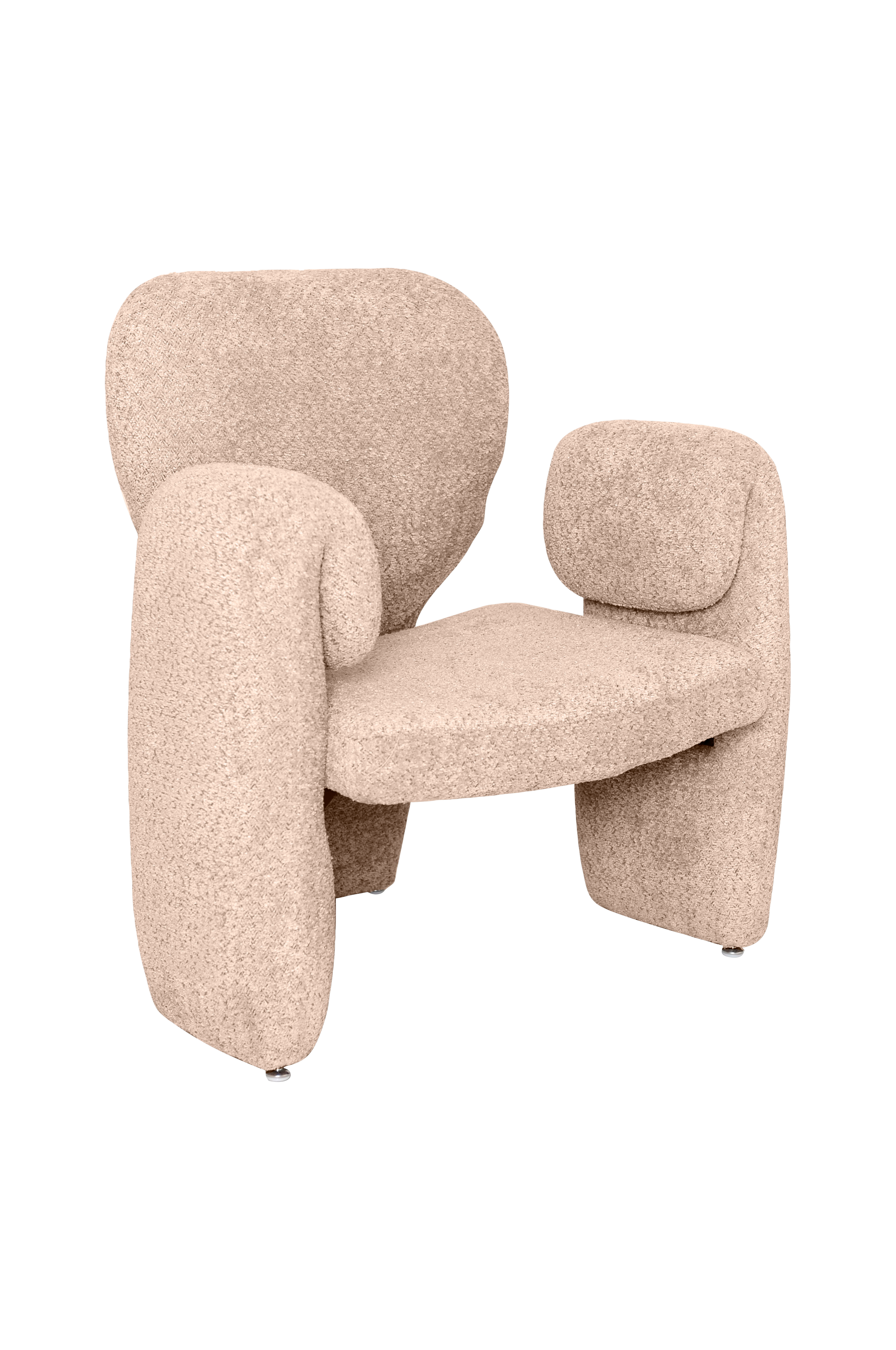 Moderni nojatuoli pehmeässä ja pyöreässä muodossa. Pehmeä verhoilu peittää tämän tuolin vaahtomuovitäytteisen istuimen ja selkänojan.
