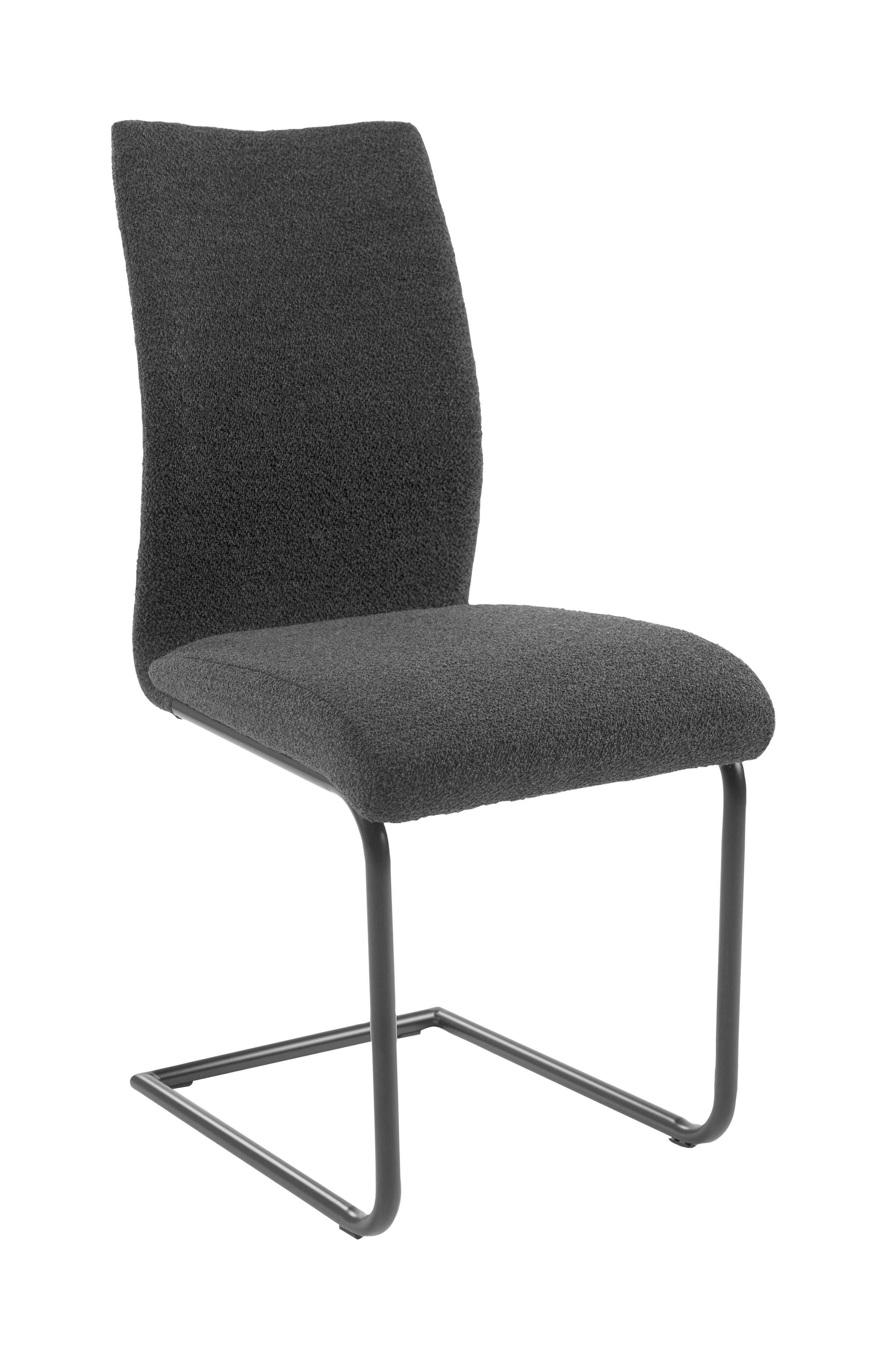 Ruokapöydän tuoli, jossa kangaspäällinen ja maalattu metallijalka. Aavistuksen joustava.