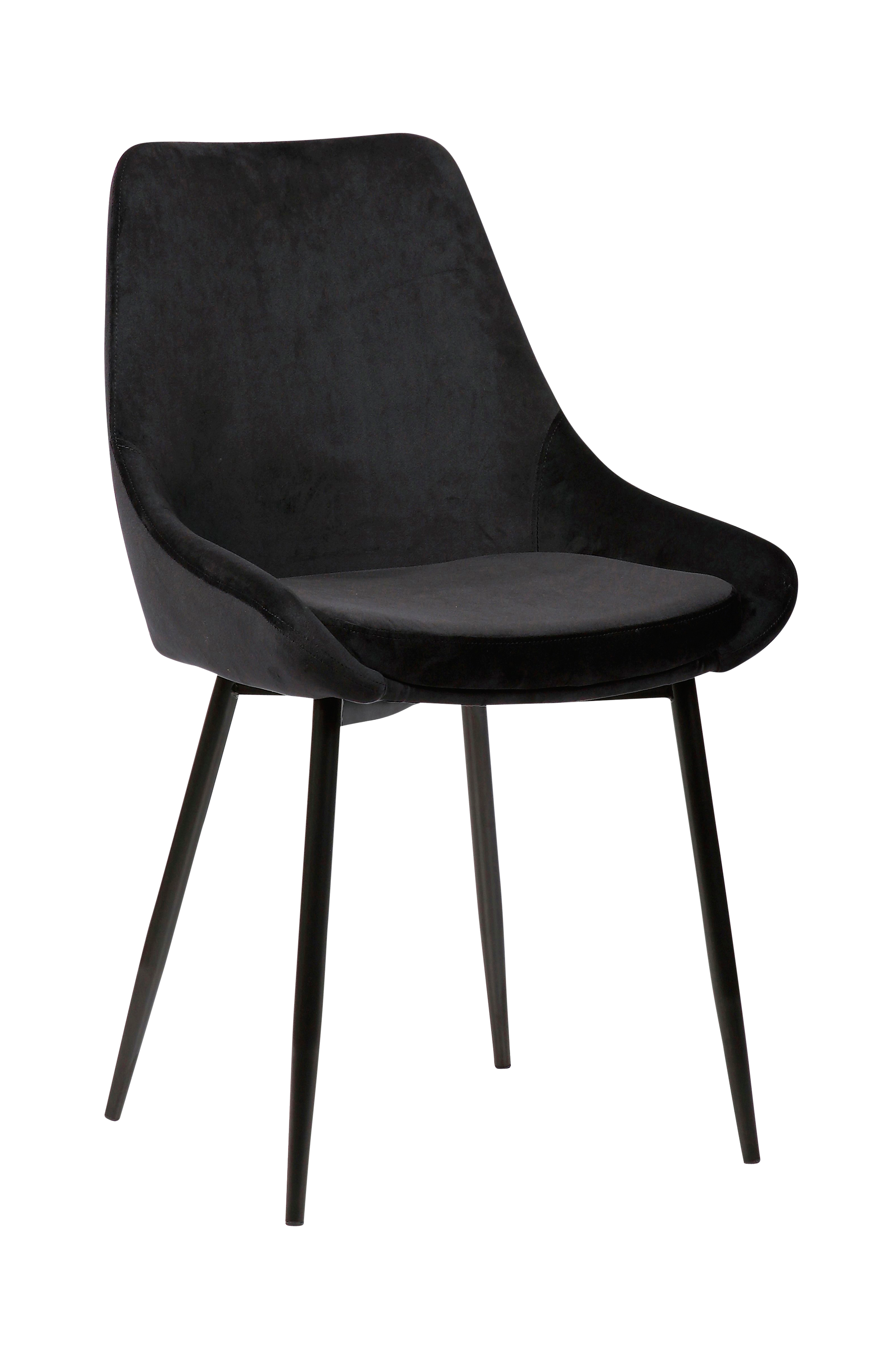 Ruokapöydän tuoli, jossa kangasverhoilu ja jalat maalattua metallia.