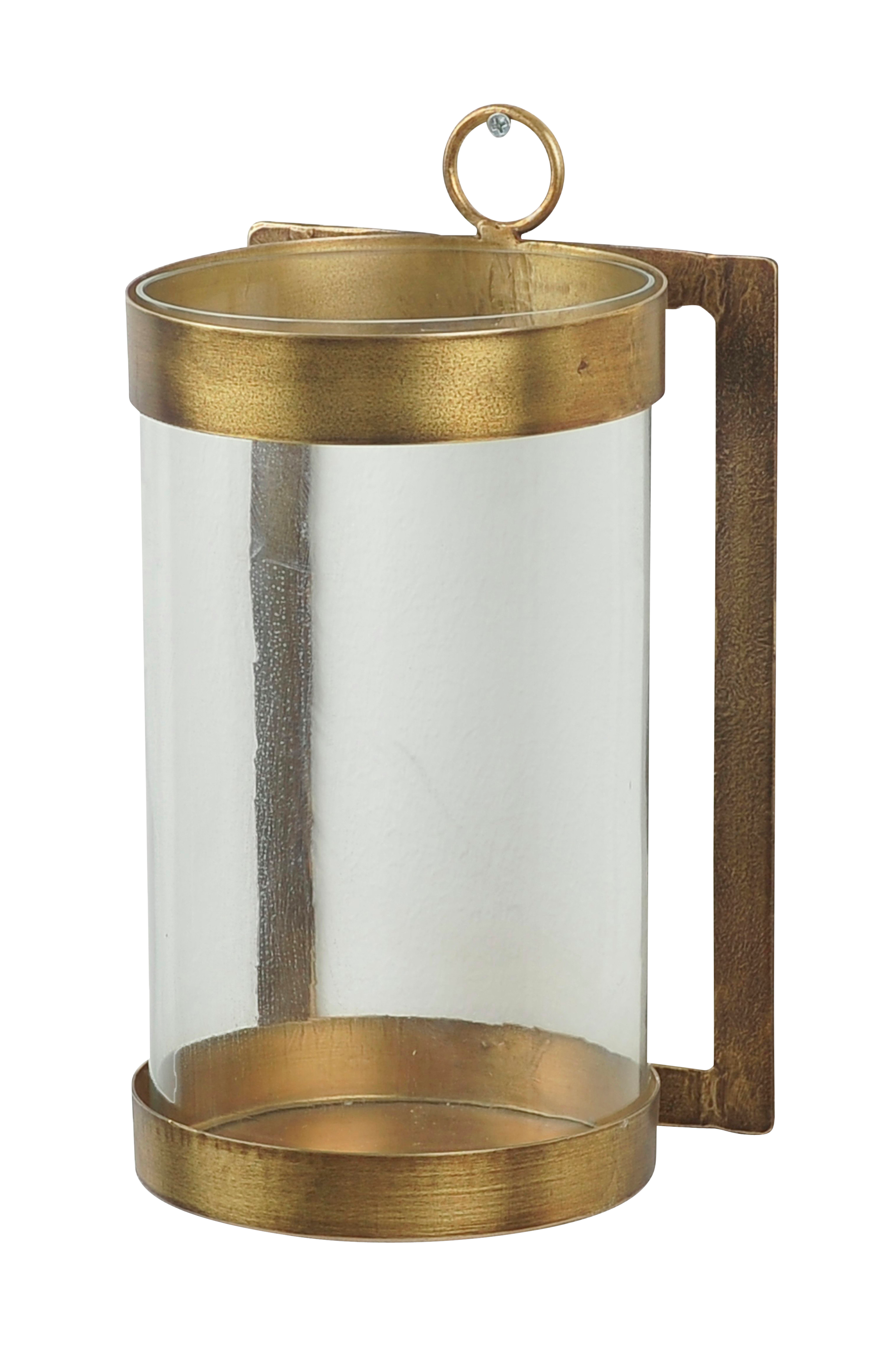 Seinälyhty. Metallia, lasinen sisäosa. Antiikkiviimeistely. Leveys 17 cm, syvyys 16 cm ja korkeus 32 cm. Toimitetaan koottuna.