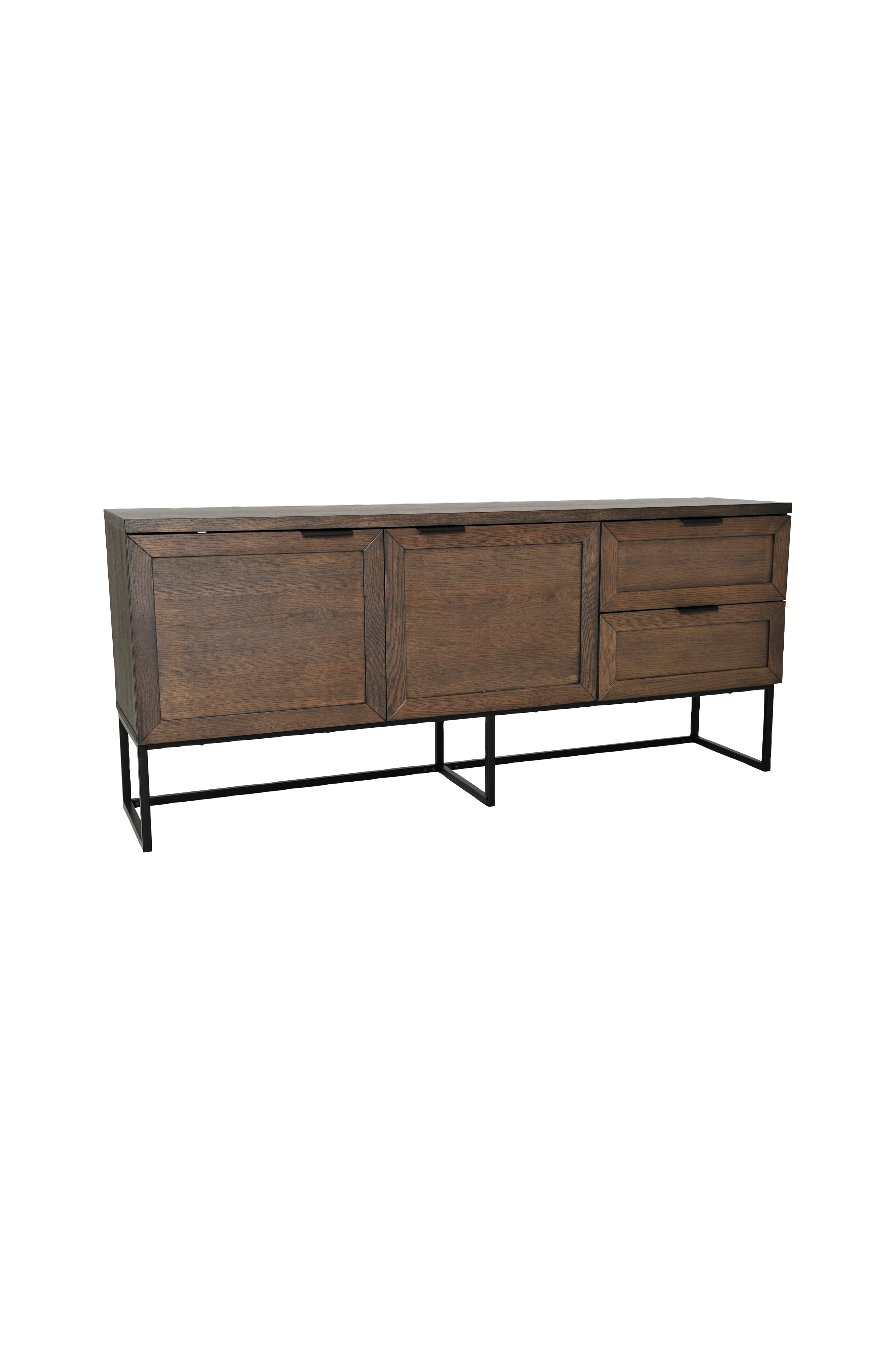 Tyylikäs sivupöytä, jossa on tiukka metallijalusta. 2 laatikkoa ja 2 säilytyskaappia.