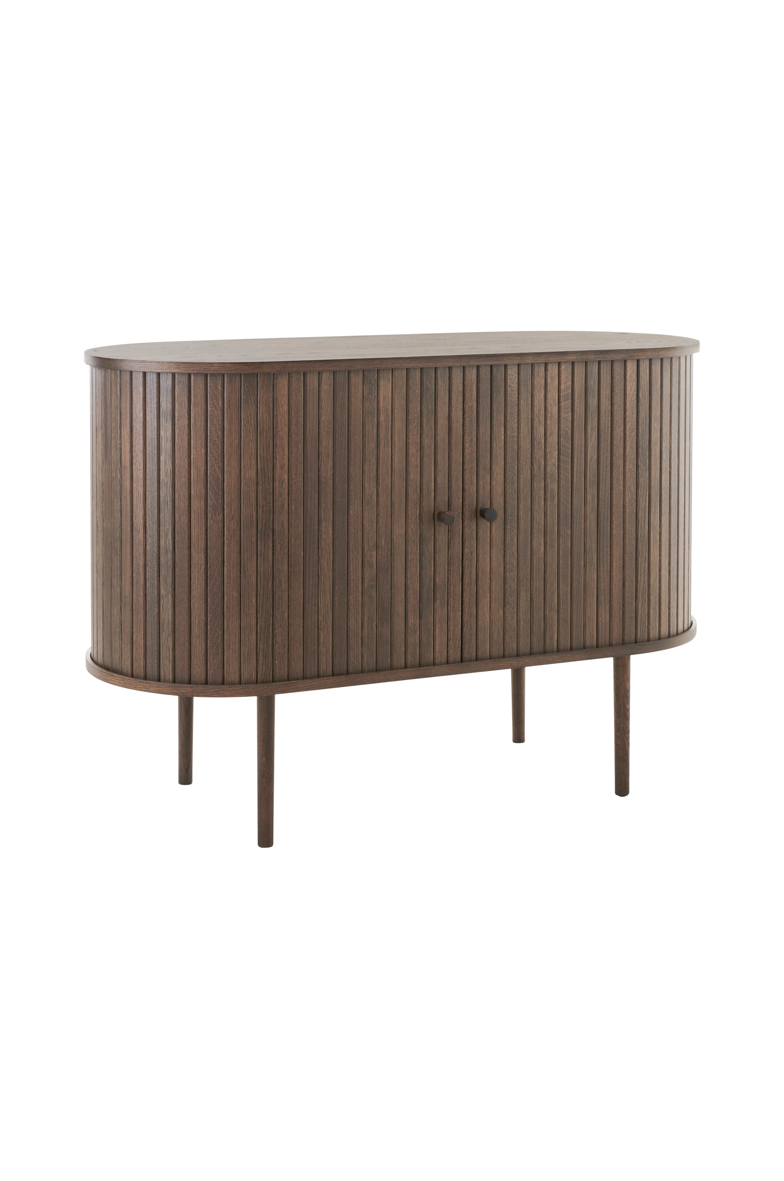 Trendikäs pieni lipasto, jossa on liukuovet.