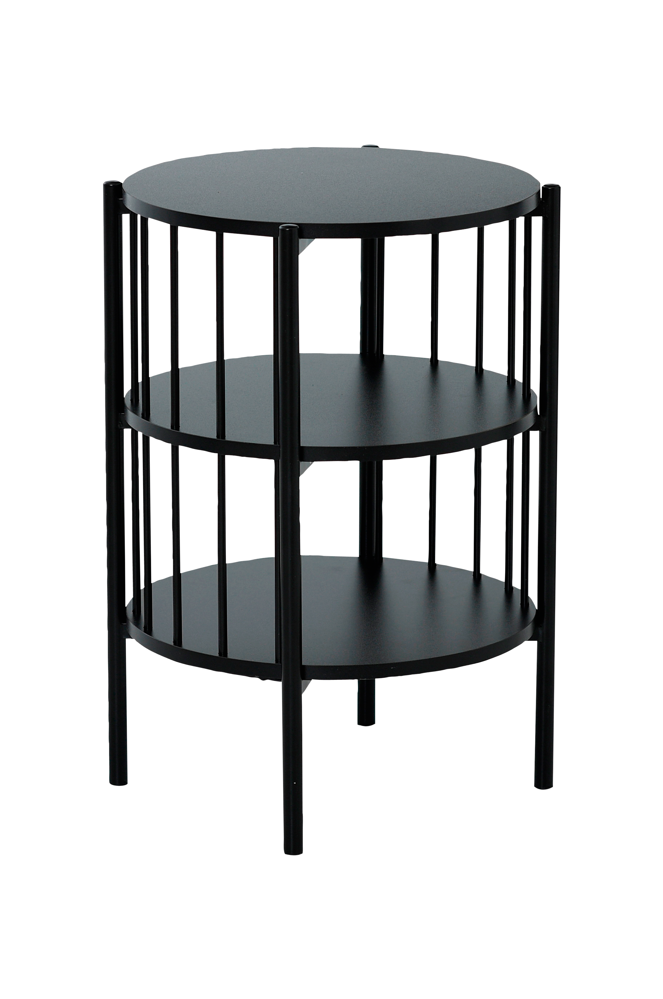 Moderni, pyöreä sivupöytä, jossa on tyylikäs, minimalistinen muotoilu. Se on valmistettu hyllyjen osalta lakatusta mdf-levystä ja rungon osalta tukevasta metallista. Pöydässä on kolme pyöreää tasoa, jotka tarjoavat käytännöllistä säilytys- tai esittelytilaa.