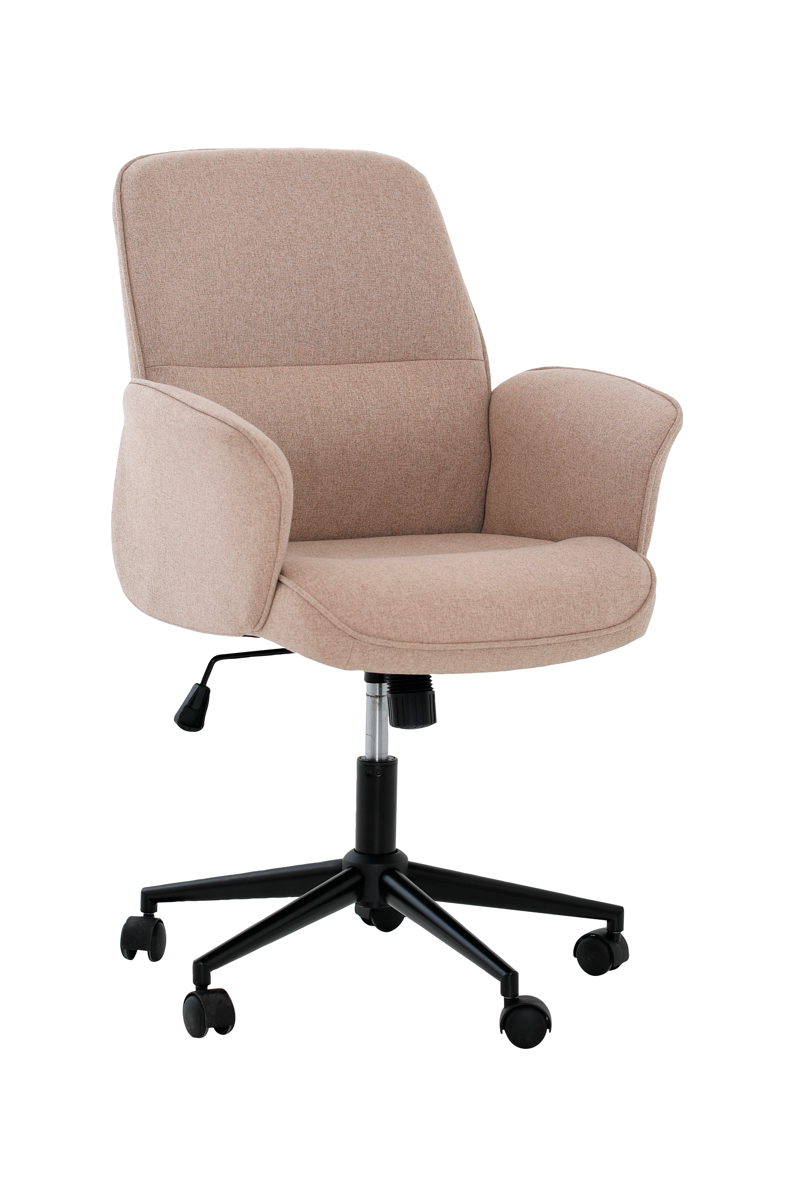 Moderni toimistotuoli, jossa on pehmeä, verhoiltu kangasistuin ja selkänoja. Tuolissa on runsaasti pehmustettu istuin ja kaarevat käsinojat, jotka lisäävät mukavuutta.