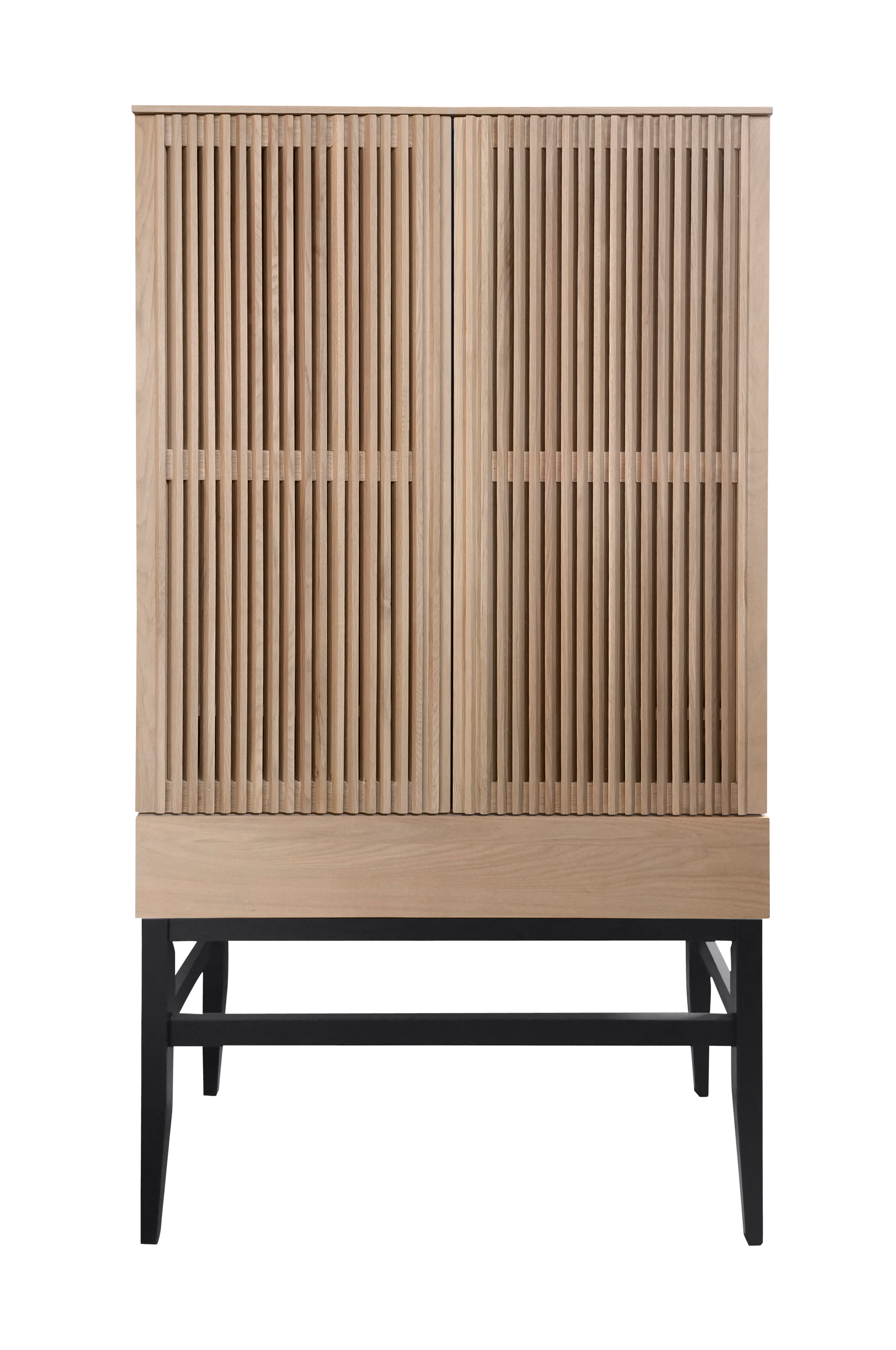 Vitriinikaappi saarniviilutettua MDF-levyä. Massiiviset ovet ja jalat tammea. Kaksi ovea ja yksi laatikko.