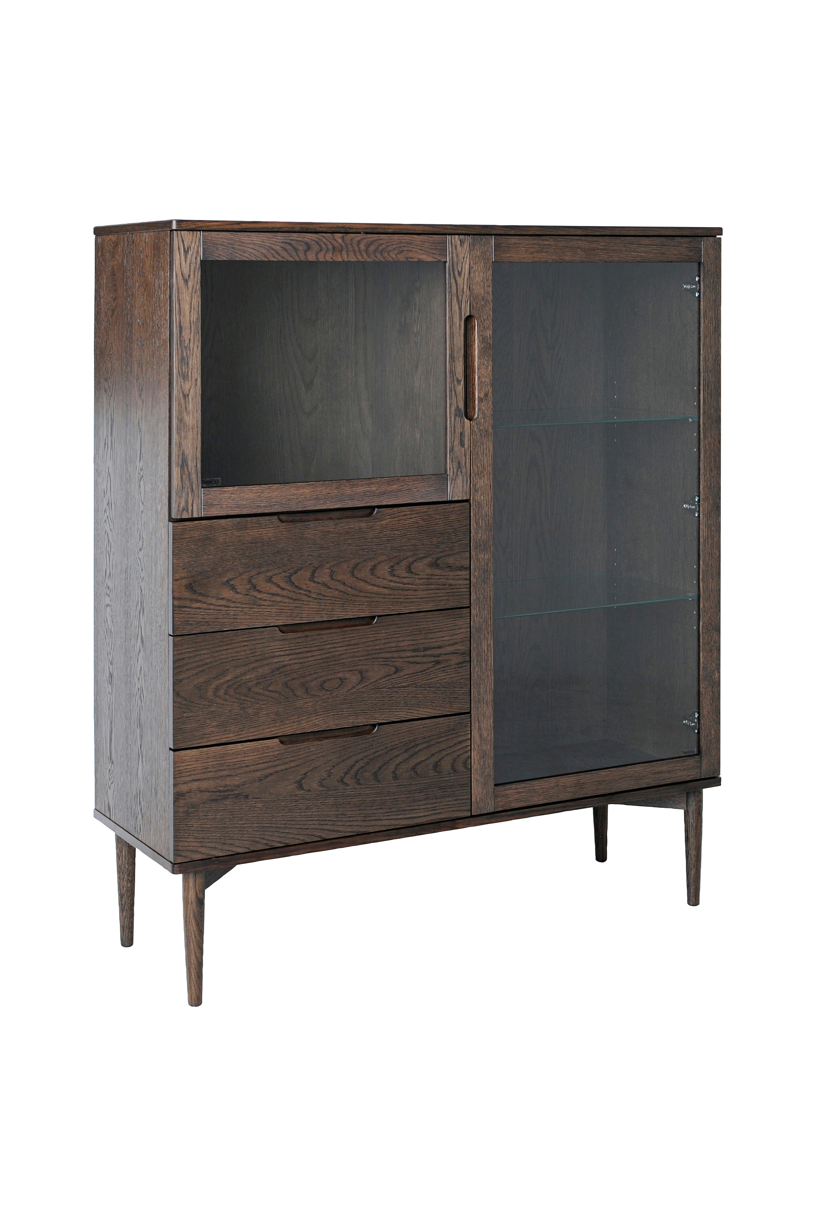Moderni vitriinikaappi öljyttyä tammea. 3 laatikkoa ja 2 lasiovea.