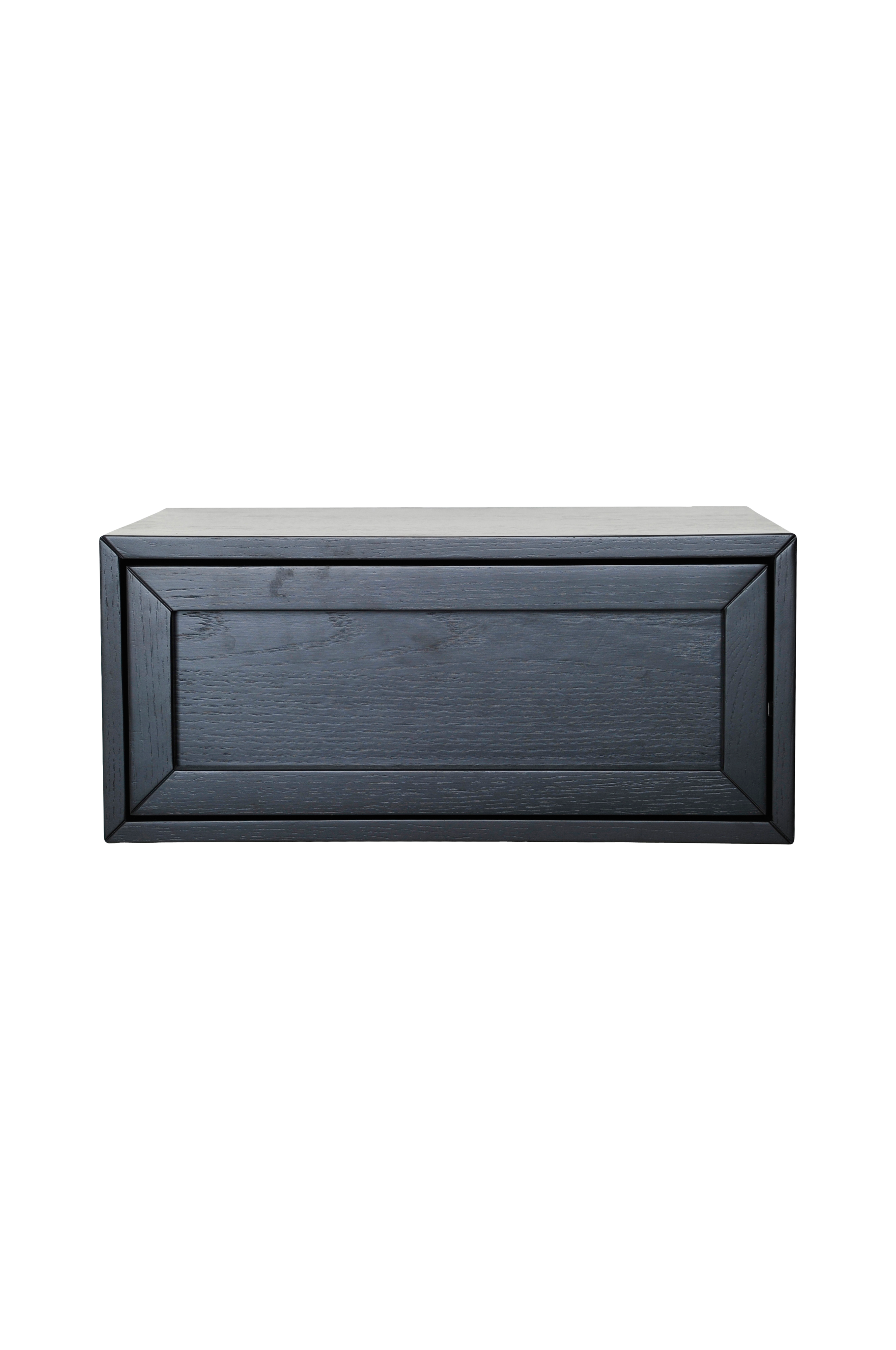 Kätevä laatikollinen yöpöytä seinälle. Lakattua tammiviilua.
