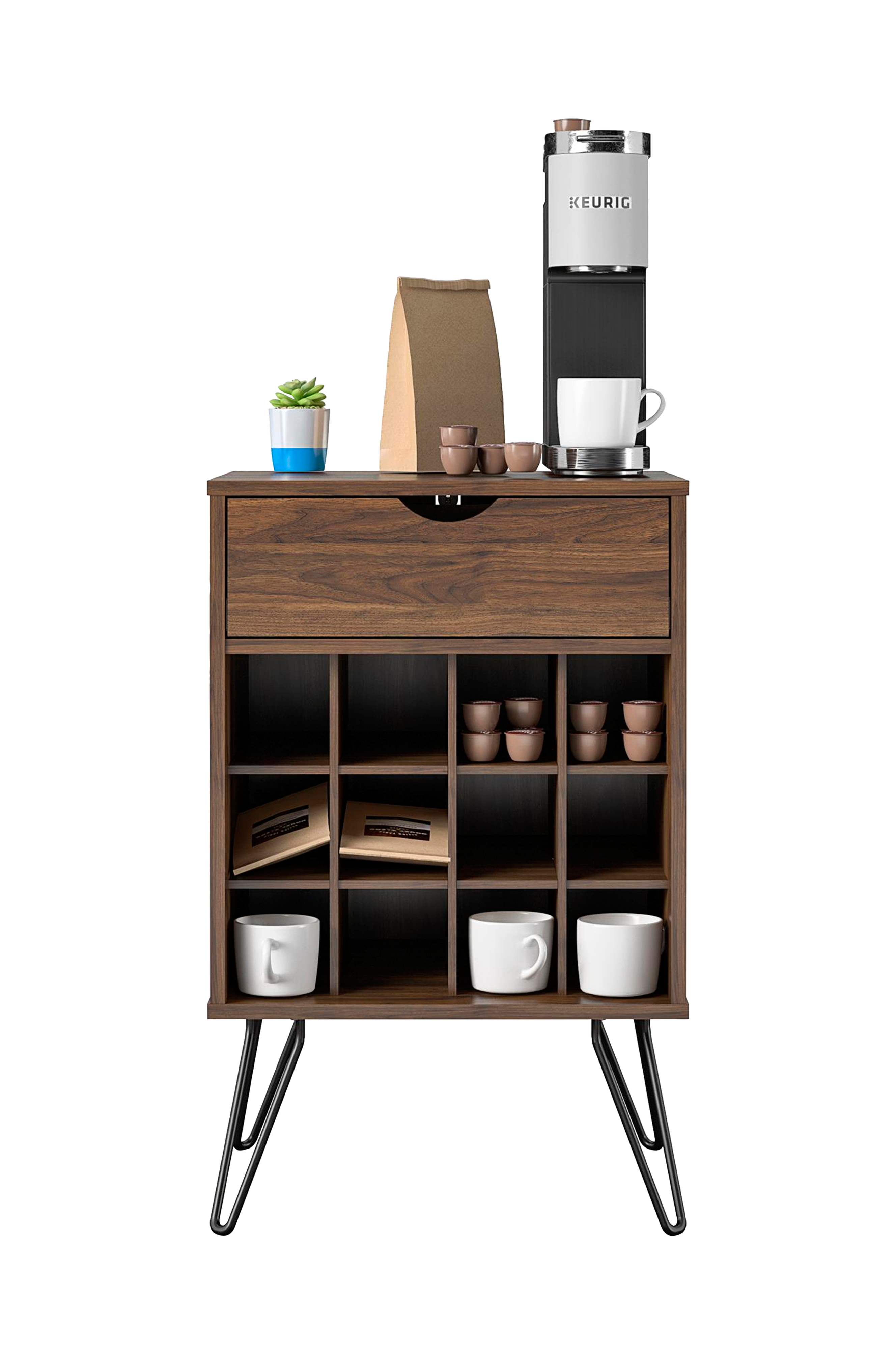 Anna olohuoneellesi retrohenkinen ilme tällä kauniilla säilytystelineellä. Puukuvioitu runko ja laatikon etuosa, jossa on ruskean sävyjä laminoidussa mdf- ja lastulevyssä, antavat telineelle tukevan rakenteen. Mustat rautajalat tuovat retroa.
