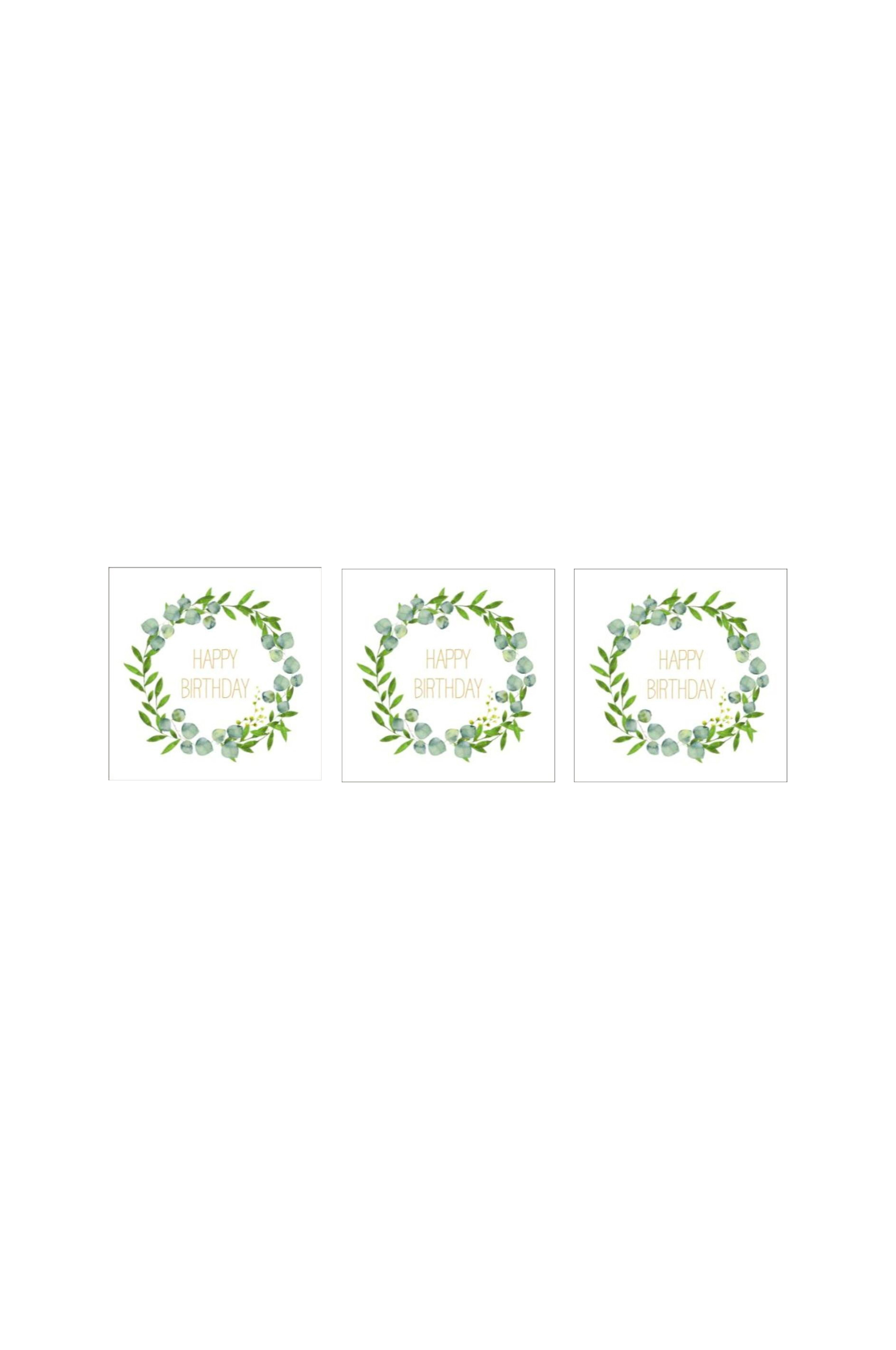 Lautasliinat, joissa Happy Birthday -teksti vihreän kranssin keskellä.