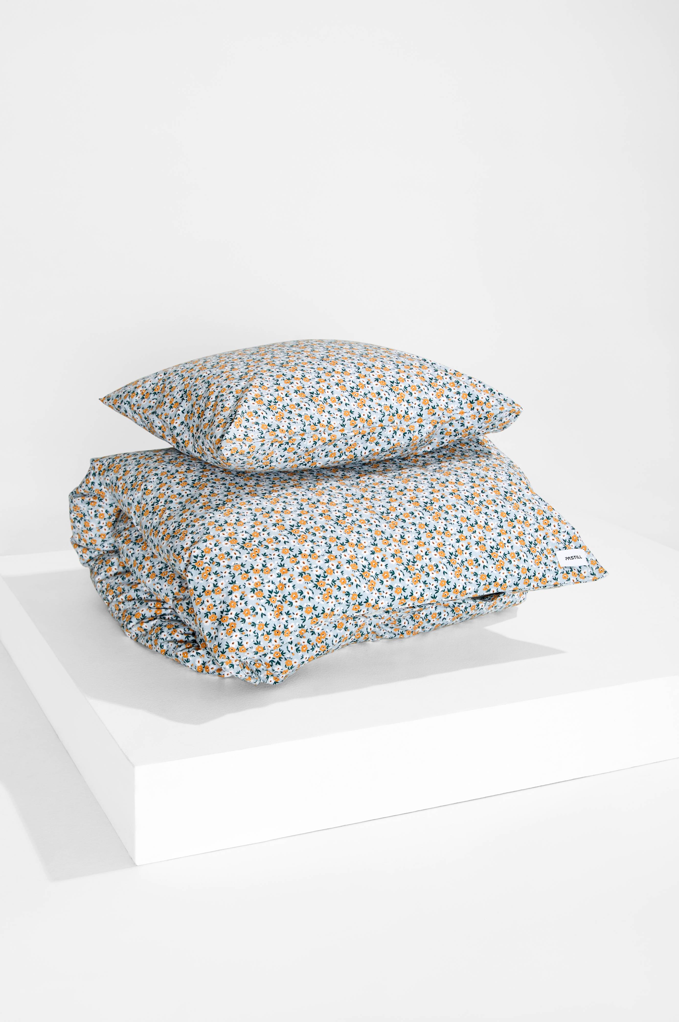 Flora on kuin kukkainen kesäunelma. Pehmeästä perkaalista valmistetut vuodevaatteet ovat miellyttävän ja viileän tuntuiset nukkuessa. Pienikukkainen puuvillakangas on pesty erittäin pehmeän tunnun saamiseksi, ja kukkakuosi ilahduttaa kaikkia kesän ystäviä. Langantiheys 200 TC. Pussilakanasetti sisältää pussilakanan ja tyynyliinan. Pussilakanassa on piilopainonapit alhaalla aukon reunassa.