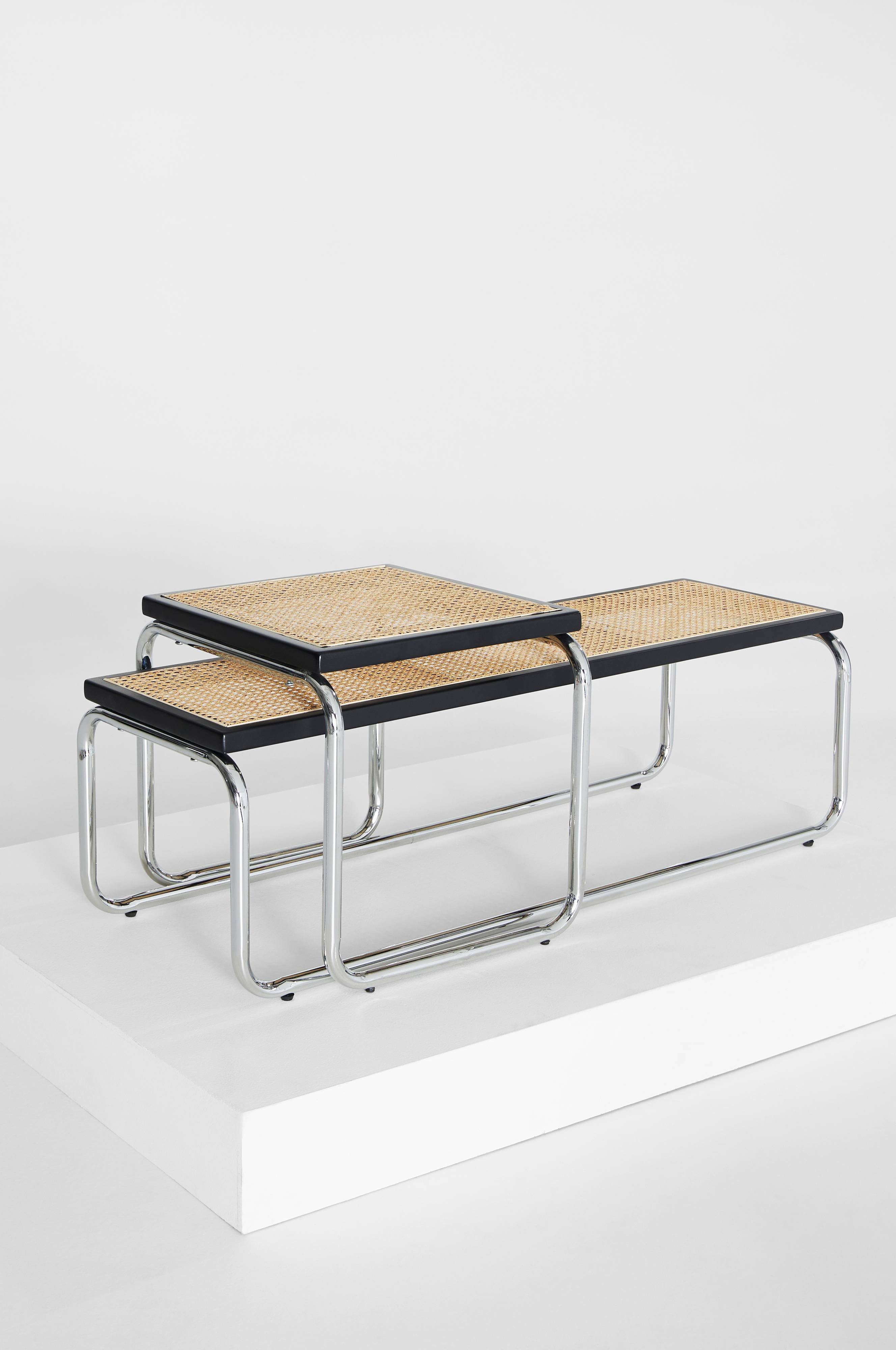 Krominväriset teräsputket, mustaksi maalattu koivu ja luonnonvärinen rottinki ovat tunnusomaista Meraki-mallistolle. Elegantti, retrohenkinen ja trendikäs. Kahden pöydän setti, jossa suuri pöytä on matala ja loungehenkinen ja pienemmässä pöydässä on korkeampi jalusta. Klassinen ulkomuoto. Krominväriset jalat yhtenäistä teräsputkea, jossa on pyöristetyt kulmat. Pöytälevyn ympärillä oleva kehys on FSC-sertifioitua koivua ja pöytälevy klassisesti punottua rottinkia.