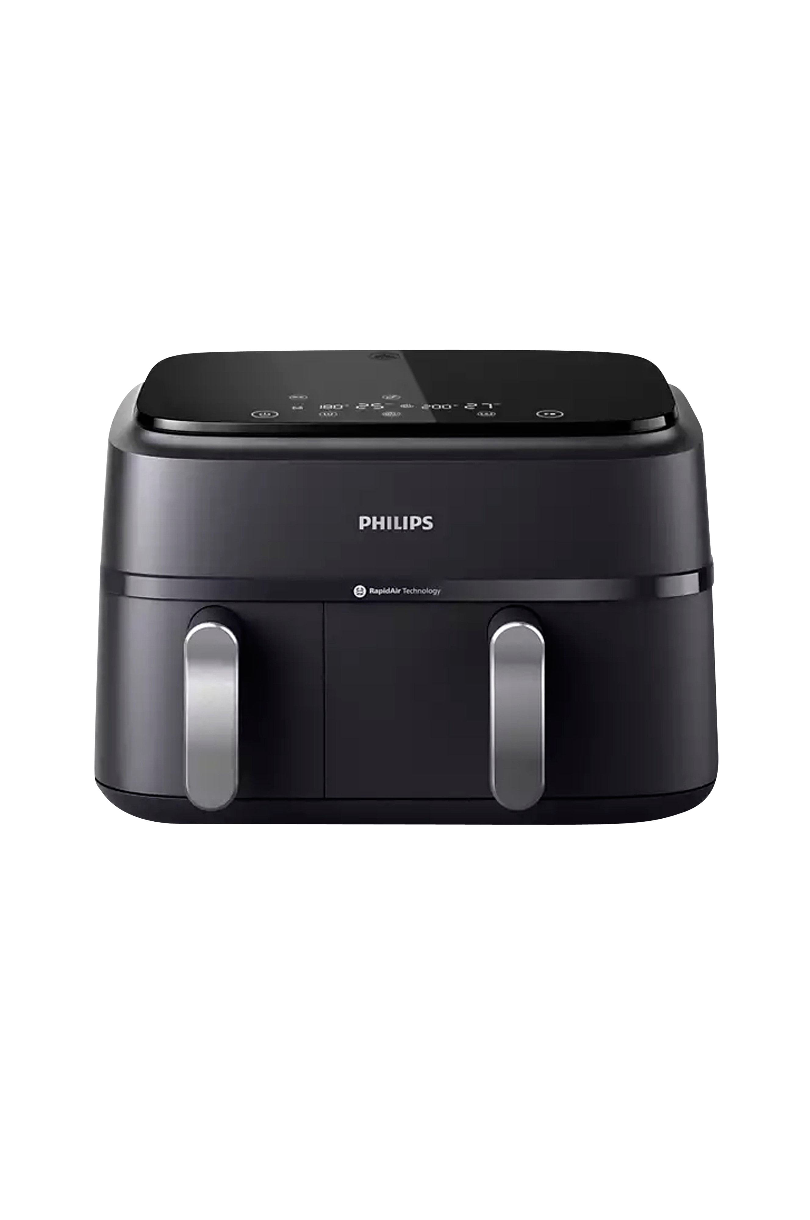 Philips Airfryer 3000 -sarjan kaksoiskorissa on kaksi koria eri ruokien samanaikaista kypsennystä varten synkronoidulla kypsennysajalla. Suuri kori sopii pääruoille ja pienempi kori lisukkeille. Rapid Air -tekniikan ansiosta lämpö jakautuu tasaisesti, jolloin lopputulos on rapea ja mehukas. Helppo puhdistaa, sillä kaikki osat ovat astianpesukoneen kestäviä. Ilmankuivaimessa on 9 litran tilavuus, 8 esiasetusta, intuitiivinen kosketusnäyttö sekä toiminnot kypsennysaikojen synkronointiin ja kopiointiin. Jopa 90 % vähemmän rasvaa ja nopeat kypsennysajat säästävät sekä aikaa että energiaa.