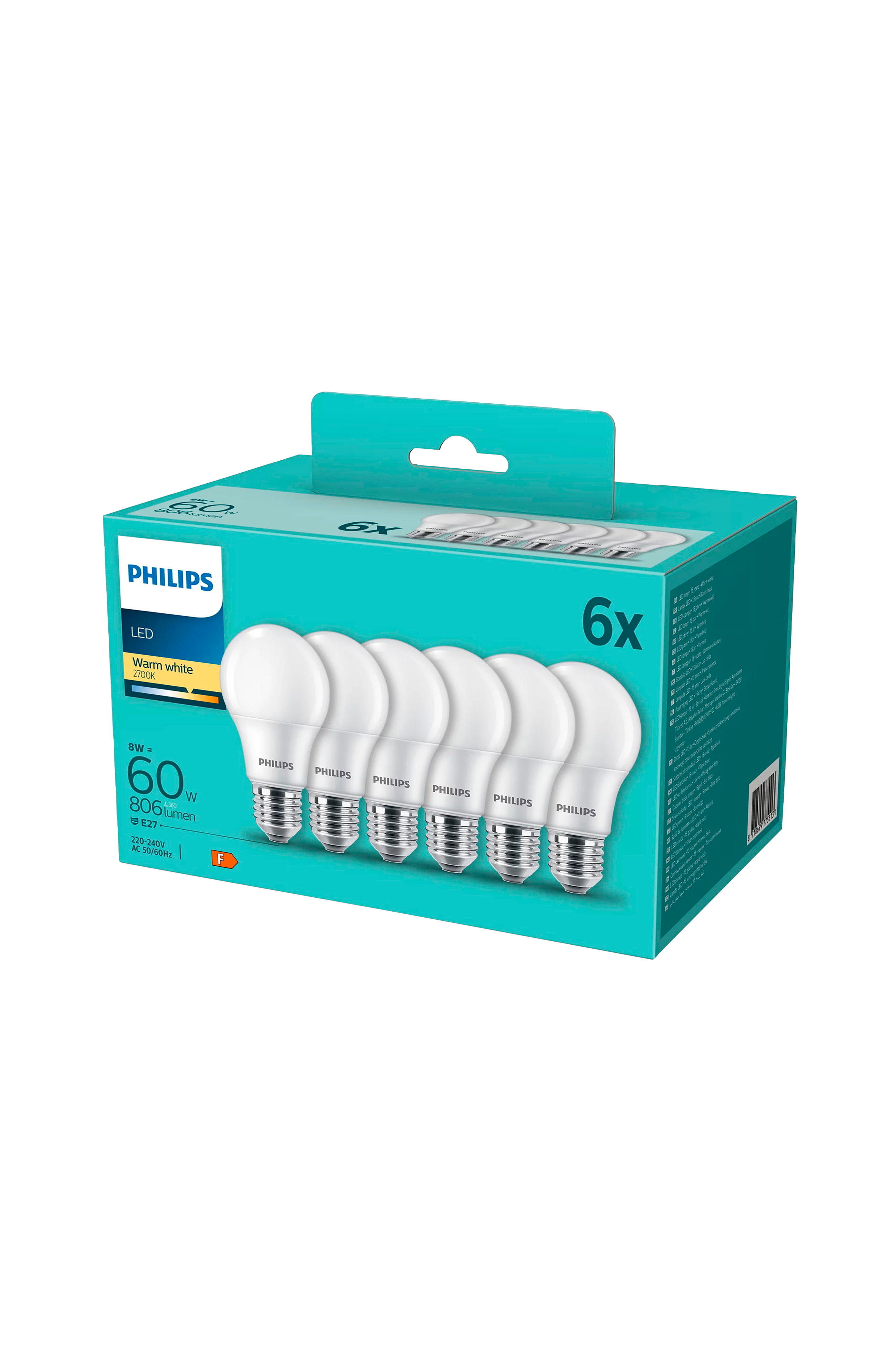 Monipakkaus sisältää kuusi normaalia LED E27 -lamppua. Yhden lampun teho vastaa 60 wattia.