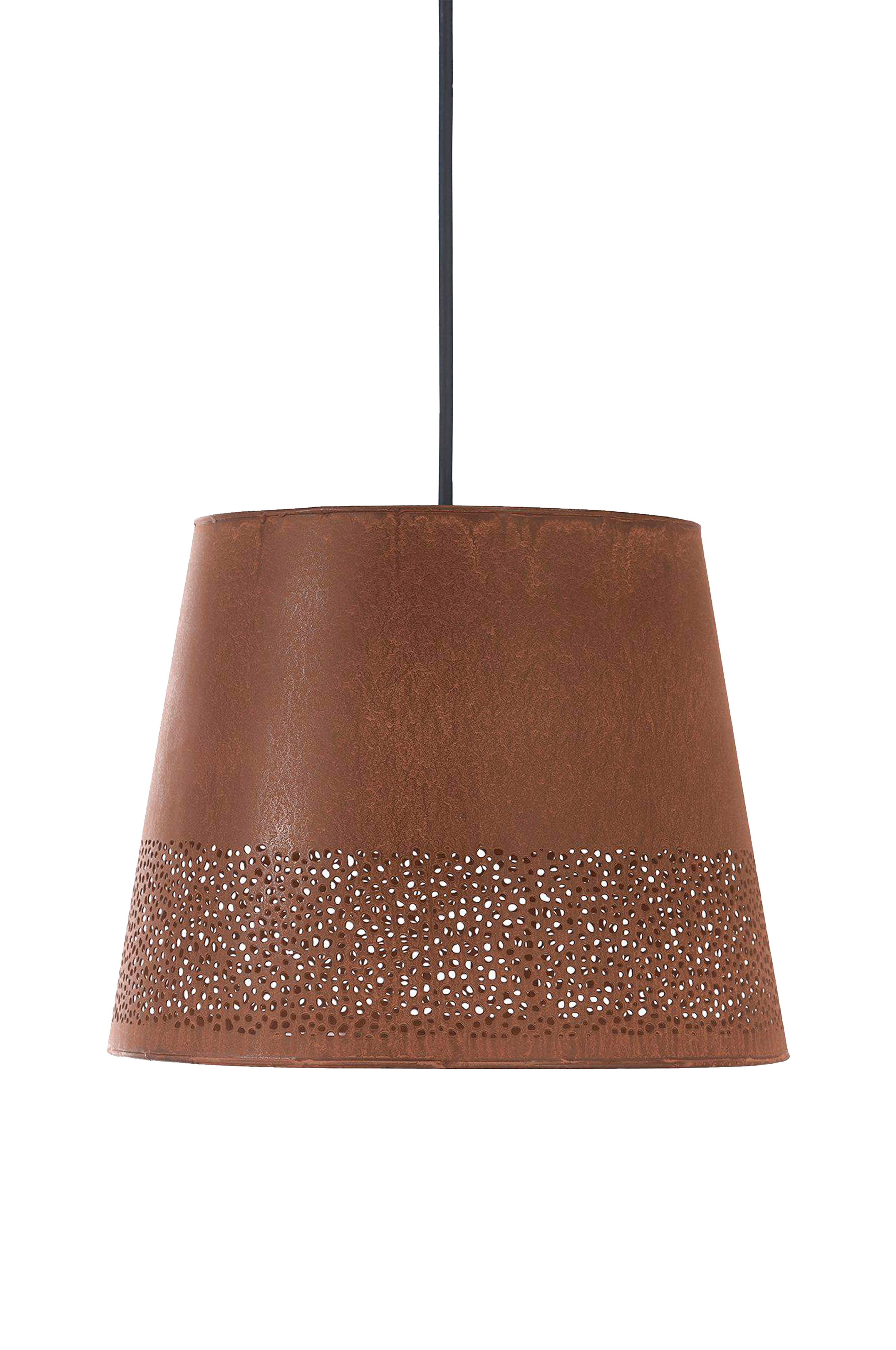Corta-kattovarjostin metallia. Varjostimen alaosassa on reikäkuvio, joka antaa kauniin valon, kun lamppu palaa ja valo virtaa ulos kuvion läpi. Ruosteenvärinen pinta. Halkaisija 38 cm ja korkeus 30 cm. Varjostin myydään erikseen. Varjostin sopii Flex Out -kattoripustussarjaan, joka on hyväksytty ulkokäyttöön. Varjostimessa on E27-rengaskiinnike.