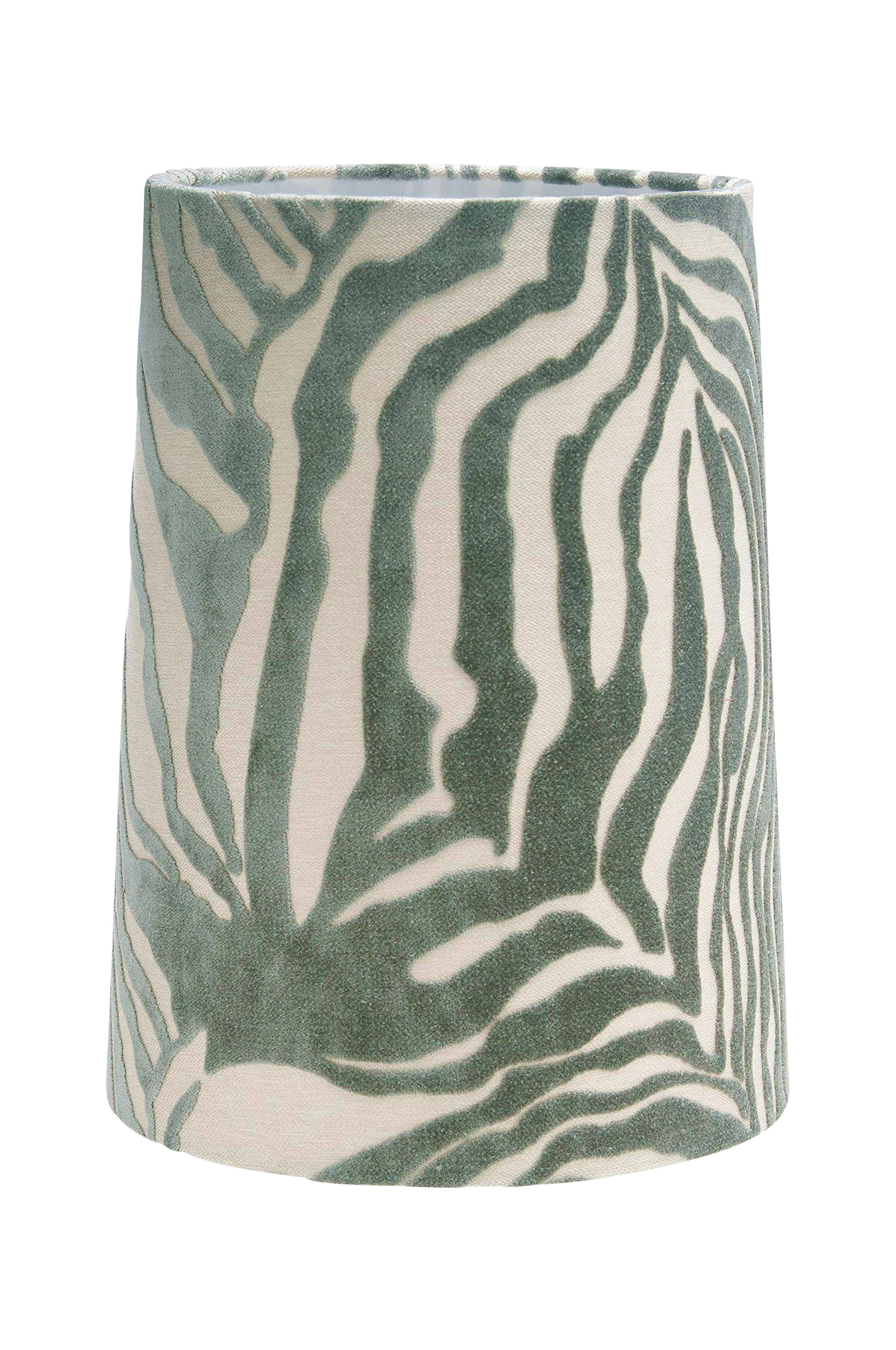 Annie-lampunvarjostin, jossa seeprakuvioinen kangas. Varjostimen rullatut reunat ja taitettu liitos luovat laadukkaan käsityön ylellistä tuntua. Varjostimen sylinterimäinen muoto ja valkoinen laminaatti luovat kauniin valaistuksen, kun lamppu on päällä. E27-lampunkanta on 4 cm alareunasta.