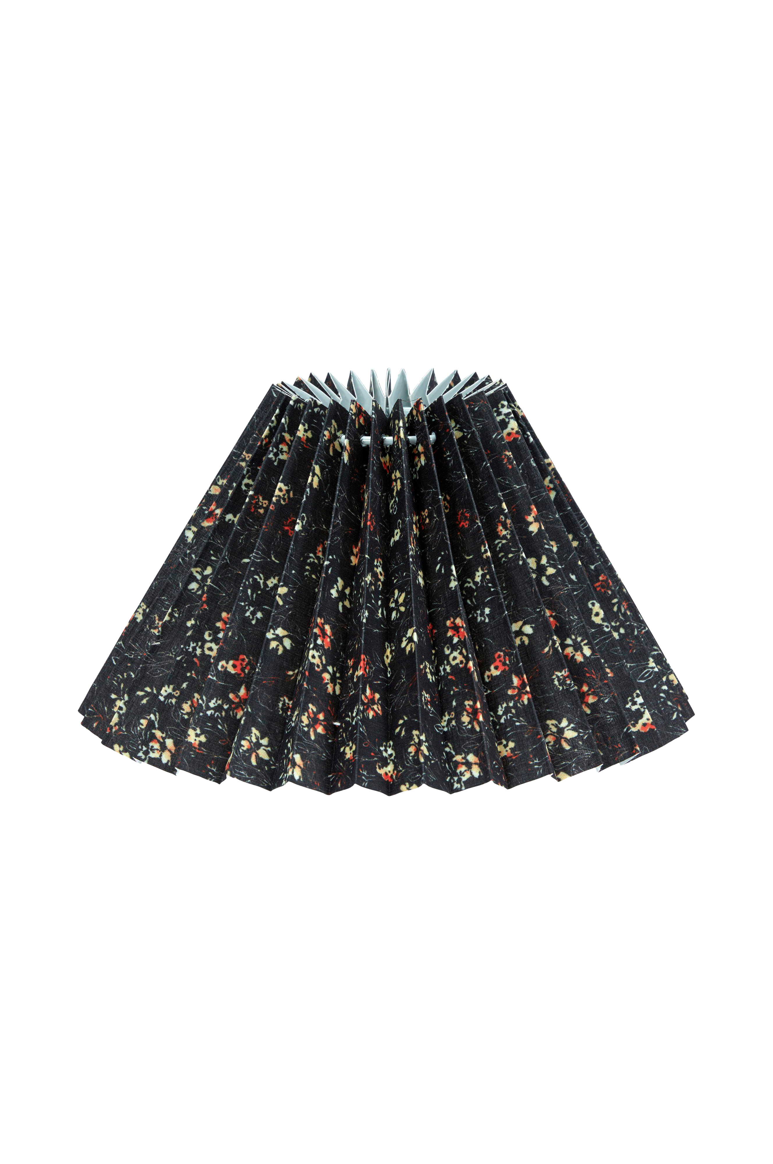 Ines laskostettu lampunvarjostin, jossa on kukkakuvioinen kangas. Kartiomuotoinen lampunvarjostin on sisältä valkoinen, mikä antaa mukavan valon. E27-ripustin, joka istuu 5cm pohjasta. Lampunvarjostimessa on käännettävä kiinnitys, joten se sopii sekä pöytävalaisimiin että katto- tai lukulamppuvalaisimiin. Halkaisija ylhäältä 10cm, halkaisija alhaalta 25cm, korkeus 14cm.