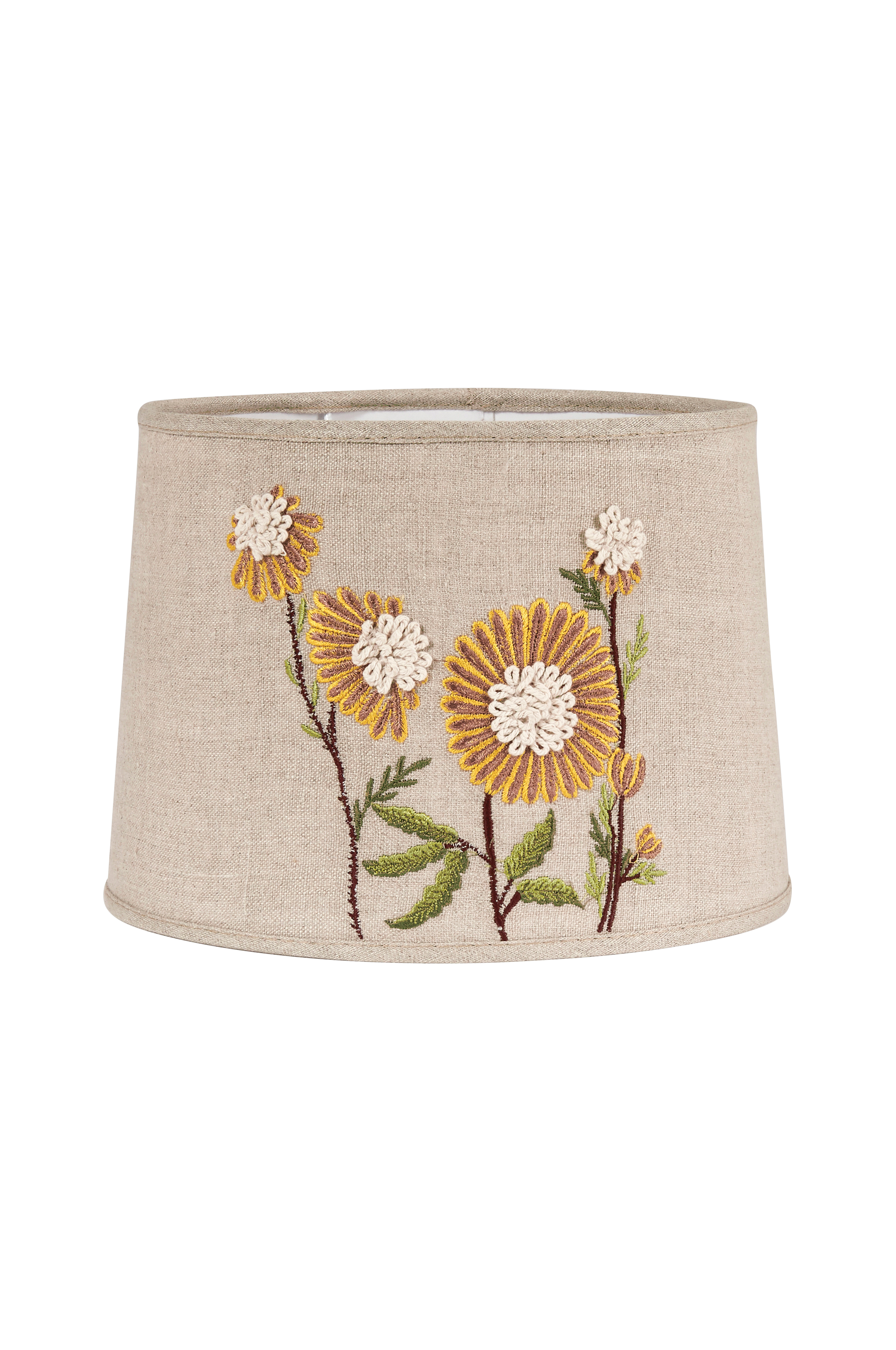 Sofia-lampunvarjostin pellavaa, jossa kirjailua. Käsintehty. Korkeus 18 cm ja halkaisija 25/22 cm.