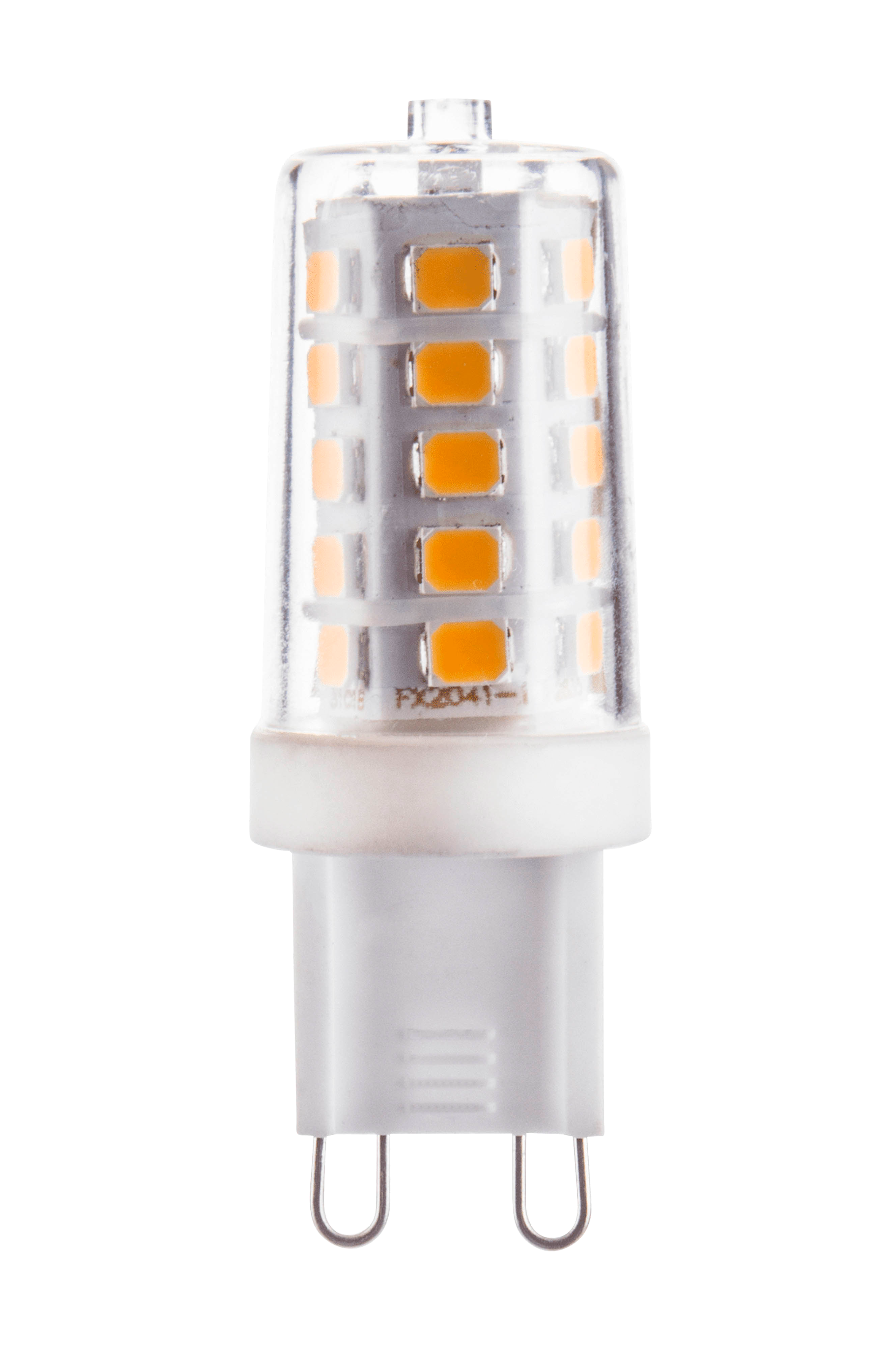 LED-lamppu, jossa G9-lampunkanta. Kirkasta lasia, jossa lämmin valo 3000 K.