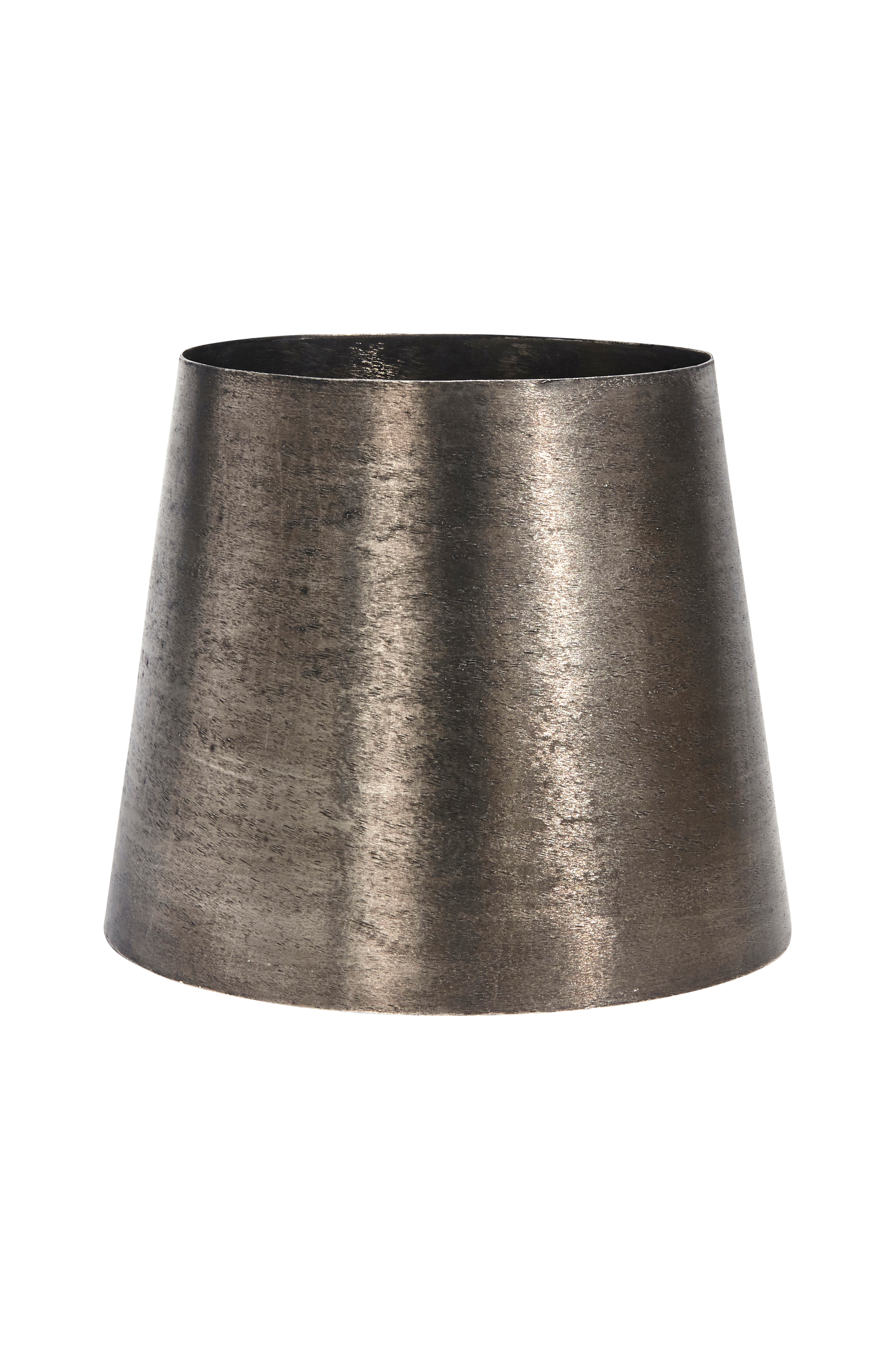 Mia-metallivarjostin. Pyöreä E27-rengaskiinnike 4,5 cm alareunasta. Korkeus 14,5 cm, halkaisija alhaalta 17,5 cm, ylhäältä 13 cm.