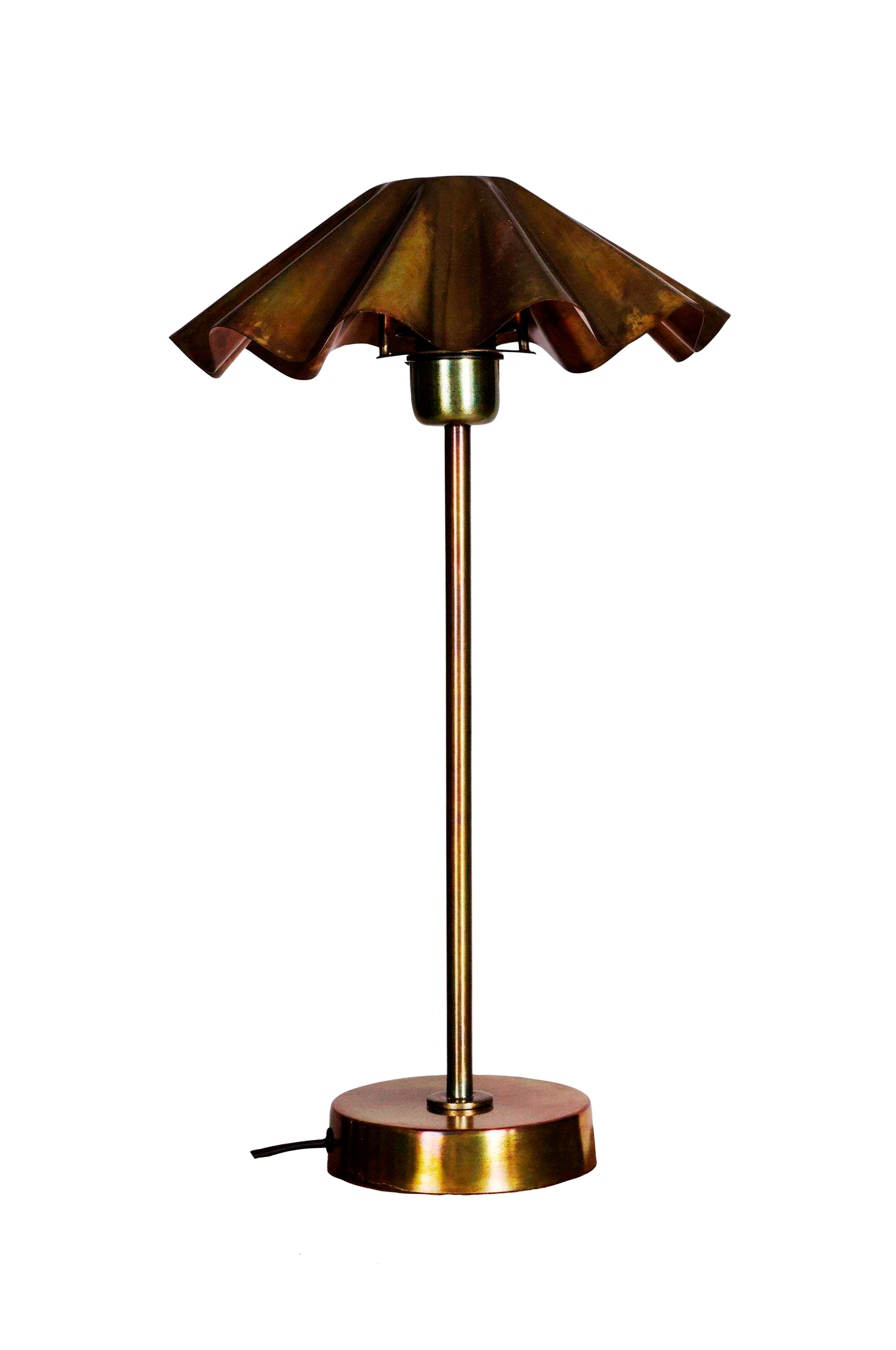 Korosta sisustustasi tällä näyttävällä pöytävalaisimella, joka on valmistettu kokonaan metallista ja joka on viimeistelty viehättävällä poltetun messingin värisellä viimeistelyllä. Pinta kimaltelee irisoivissa sävyissä, joissa on syviä sinisen, vihreän ja kuparin sävyjä, jotka muuttuvat valon mukana. Sekä jalusta että laskostettu lampunvarjostin on valmistettu metallista, mikä luo yhtenäisen ja veistoksellisen ilmeen, jossa on hienostunut mutta taiteellinen särmä. Suodatetun kuppikakun kääreen muotoinen varjostin lisää leikkisää rakennetta ja antaa samalla pehmeän ja tunnelmallisen valon. Valaisimen korkeus on 46 cm ja varjostimen halkaisija 26 cm - se on tarpeeksi kompakti pienempiin tiloihin, mutta tarpeeksi rohkea näyttääkseen. Valaisimessa on e27-pistorasia ja 160 cm pitkä musta muovijohto, jonka kytkin on sijoitettu 35 cm:n päähän jalustasta. Valonlähde ei sisälly toimitukseen. Ainutlaatuinen ja koristeellinen kappale, joka sopii kauniisti yöpöydälle, sivupöydälle tai korostukseksi mihin tahansa moderniin ympäristöön.