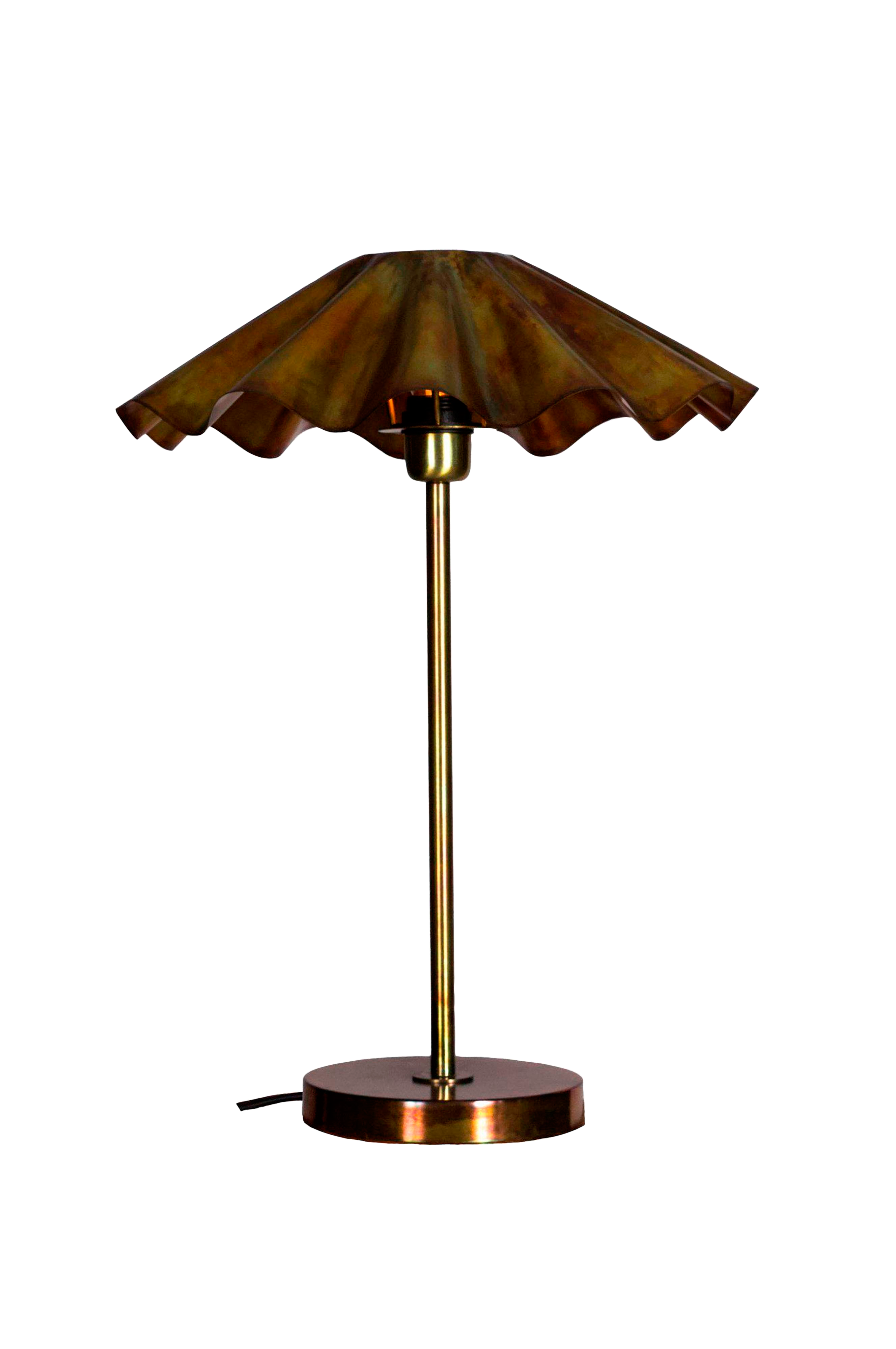 Korosta sisustustasi tällä näyttävällä pöytävalaisimella, joka on valmistettu kokonaan metallista ja joka on viimeistelty viehättävällä poltetun messingin värisellä viimeistelyllä. Pinta kimaltelee irisoivissa sävyissä, joissa on syviä sinisen, vihreän ja kuparin sävyjä, jotka muuttuvat valon mukana. Sekä jalusta että laskostettu lampunvarjostin on valmistettu metallista, mikä luo yhtenäisen ja veistoksellisen ilmeen, jossa on hienostunut mutta taiteellinen särmä. Suodatetun kuppikakun kääreen muotoinen varjostin lisää leikkisää rakennetta ja antaa samalla pehmeän ja tunnelmallisen valon. Valaisimen korkeus on 54 cm ja varjostimen halkaisija 40 cm - se on tarpeeksi kompakti pienempiin tiloihin, mutta tarpeeksi rohkea näyttääkseen. Valaisimessa on e27-pistorasia ja 160 cm pitkä musta muovijohto, jonka kytkin on sijoitettu 35 cm:n päähän jalustasta. Valonlähde ei sisälly toimitukseen. Ainutlaatuinen ja koristeellinen kappale, joka sopii kauniisti yöpöydälle, sivupöydälle tai korostukseksi mihin tahansa moderniin ympäristöön.