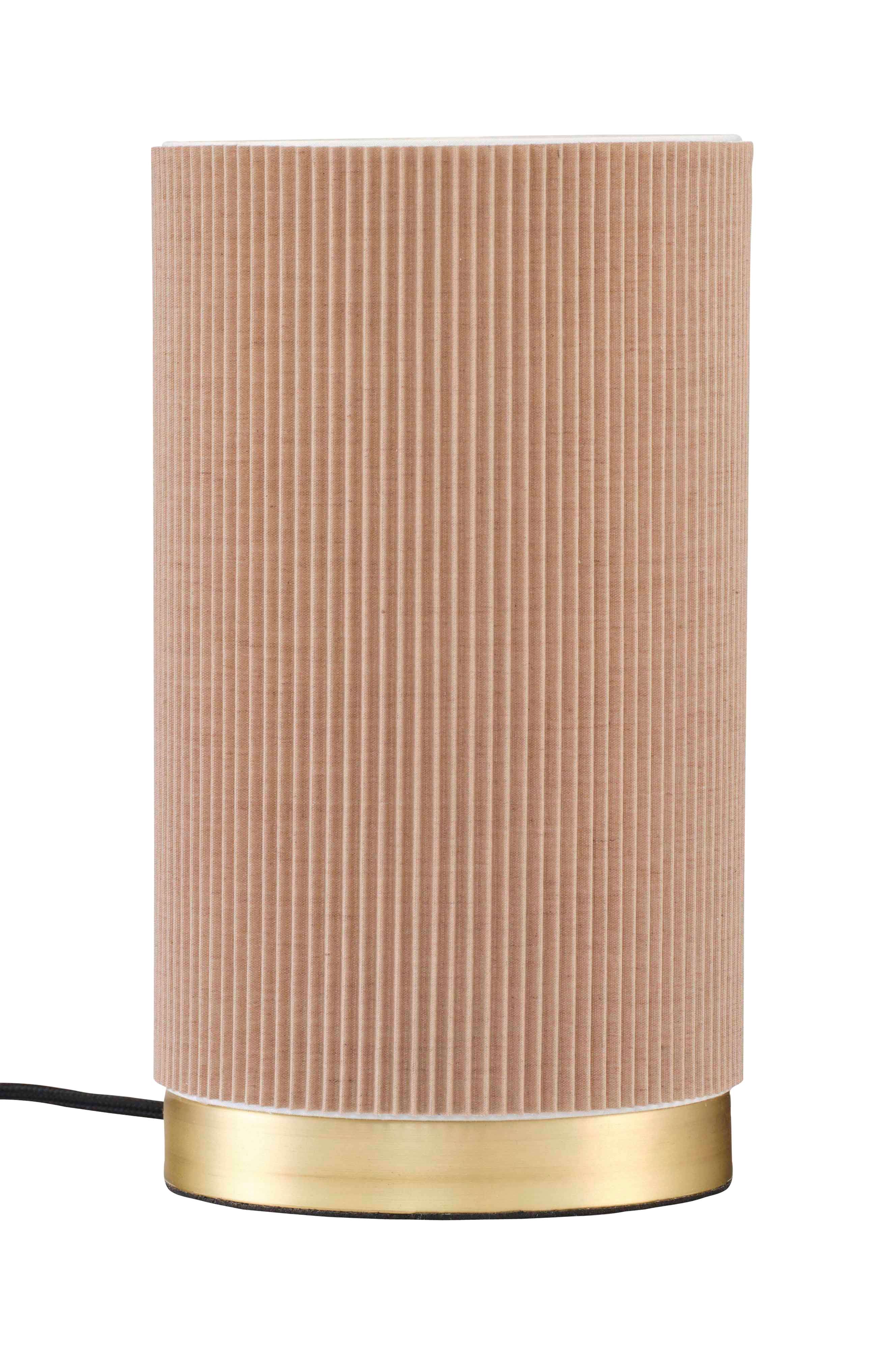 Tyylikäs pöytävalaisin kiinteällä varjostimella, joka on valmistettu laskostetusta polyesteristä ja puuvillasta. Varjostimen takana oleva laminaatti on valmistettu polystyreenimuovista.